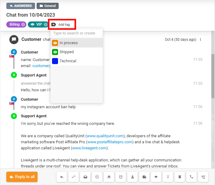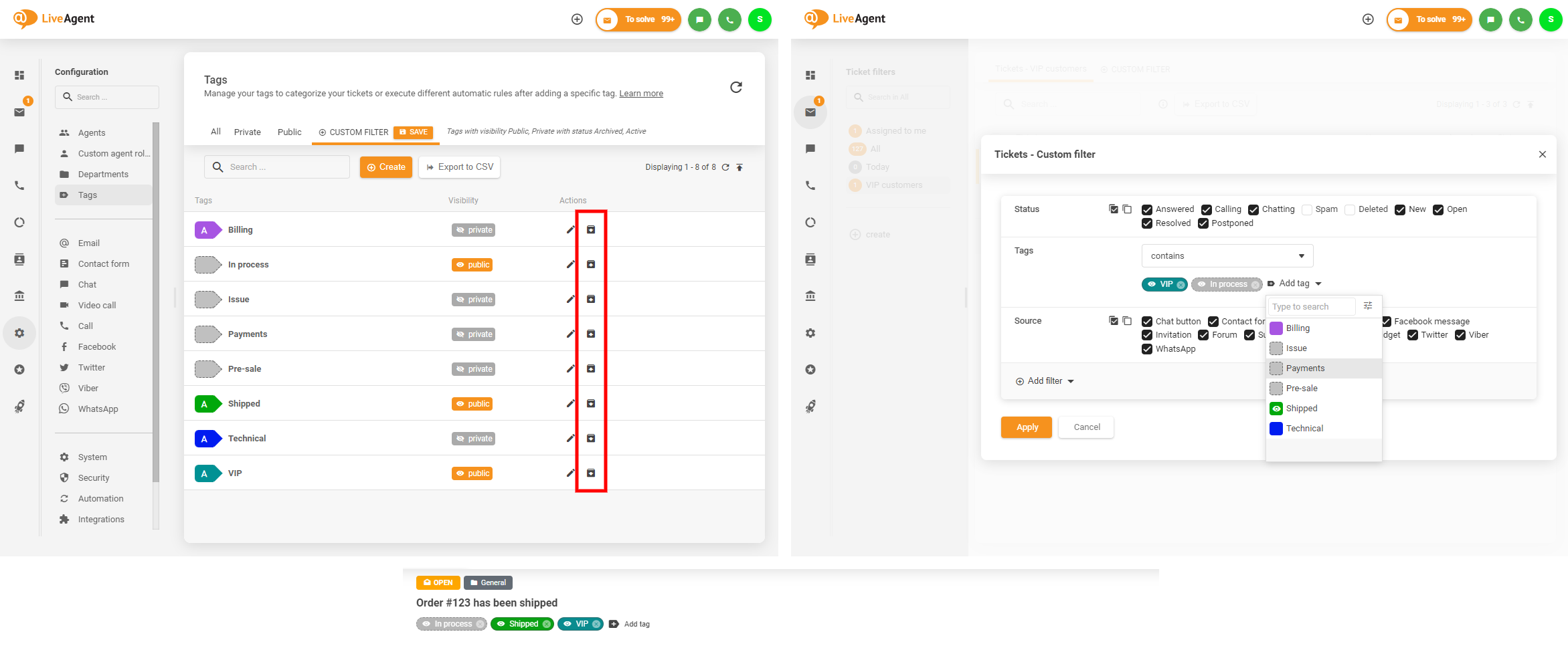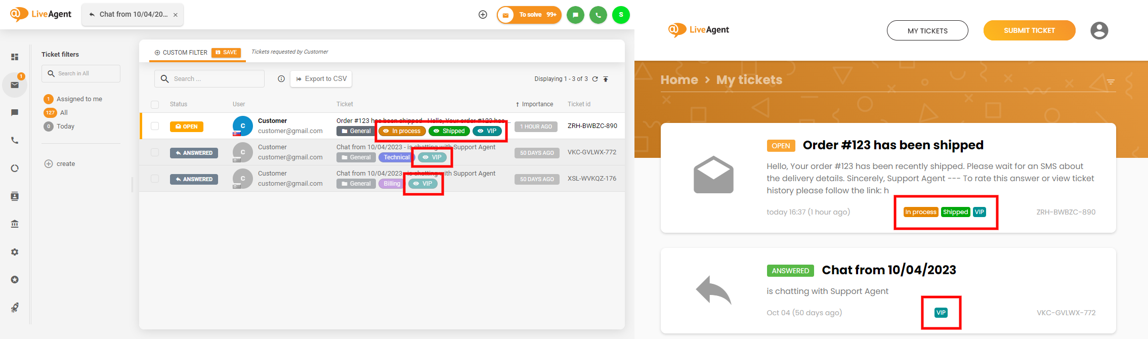 新しいタグを作成する際、**プライベート(LiveAgentパネル内のエージェントのみに表示)**のままにするか、**パブリック(カスタマーポータルの顧客にも表示)**に設定するかを選択できます。パブリックタグは、特定の顧客のすべてのチケットが一覧表示される「My Tickets」(マイチケット)セクションでのみ表示され、カスタマーポータルで特定のチケットを開いてもタグは表示されません。パブリックタグは、名前の前に目のアイコンが表示されることで識別できます。