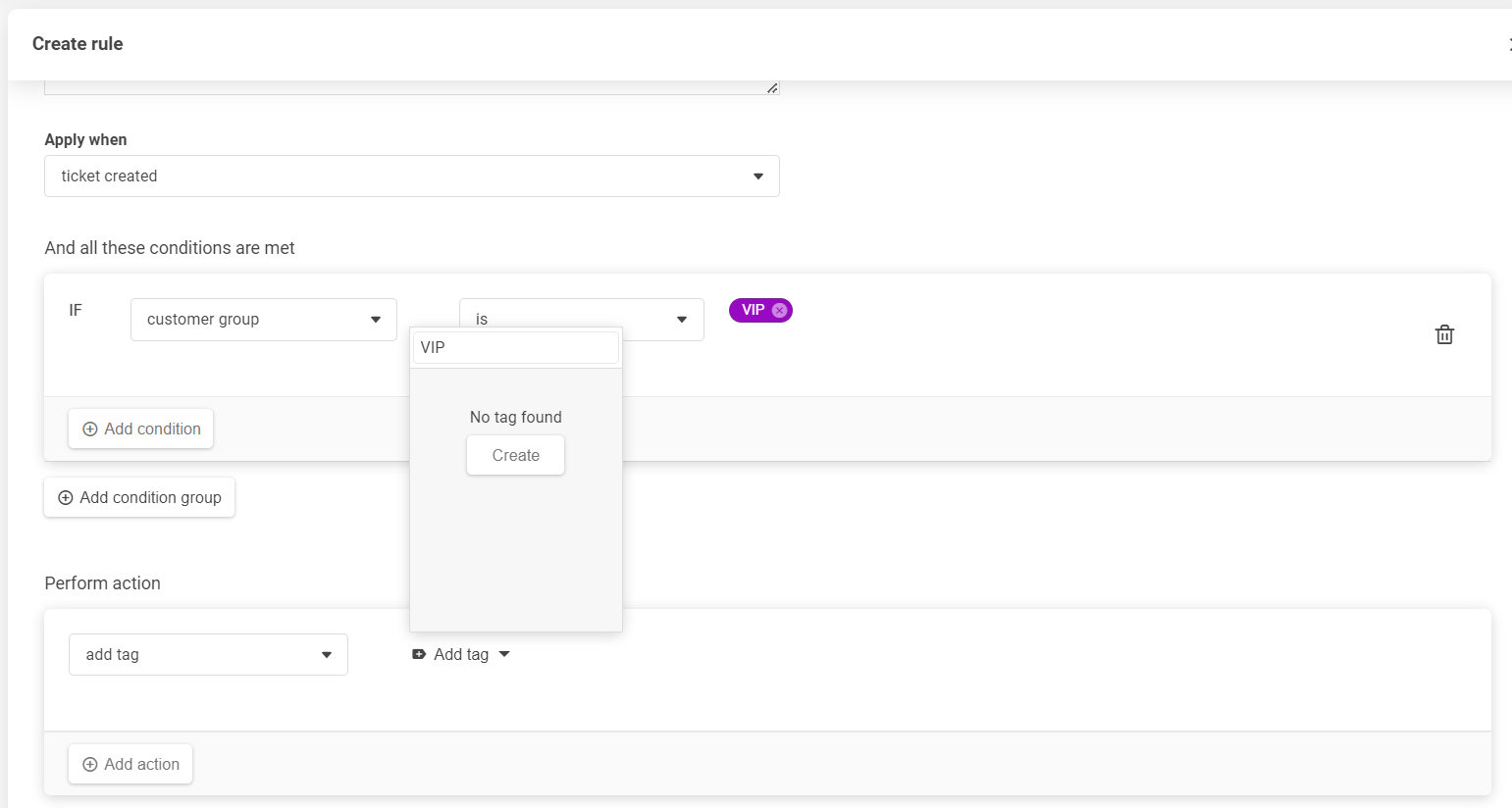 また、任意のチケット内の「Add tag」(タグを追加)ウィンドウや、ルール設定ウィンドウから直接新しいタグを作成することもできます。検索したタグ名が見つからない場合に、新しいタグを作成するオプションが表示されます。