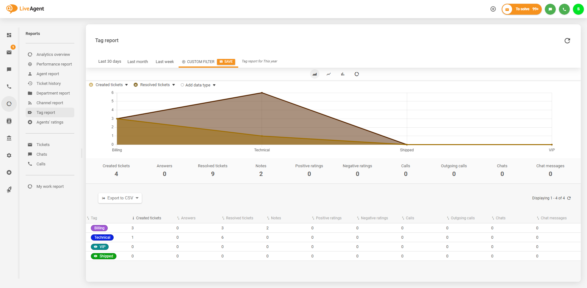 タグレポートは、会社全体のパフォーマンスを表示します。特定のタグが含まれるチケットに対して、顧客・エージェント・システムが行ったさまざまなアクションを記録します。タグレポートは、Reports(レポート)> 「Tag report」(タグレポート)から確認できます。統計は、アクションが実行される前にチケット内に特定のタグが存在する場合にのみカウントされます。詳しくはこちらをご覧ください。