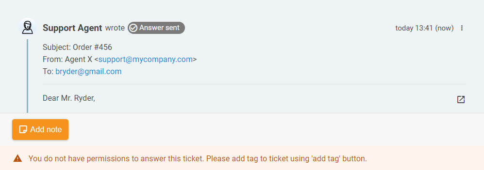 タグが付いていないチケットへの返信をエージェント(管理者やオーナーを含む)に禁止したい場合は、「Configuration」(設定)> 「System」(システム)> 「General」(一般)に移動し、「Answer tickets with tags only」(タグ付きチケットのみ回答)機能を有効にします。このオプションを有効にすると、エージェントはタグのないチケットにはメモの追加のみが可能になります。タグのないチケットにタグを追加すると、他のすべてのチケット操作ボタンが表示されるようになります。