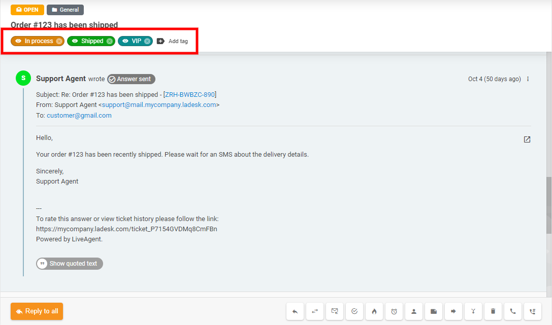 チケットへのタグの追加は、ルールを実行するためのルールトリガーとしても機能します。
