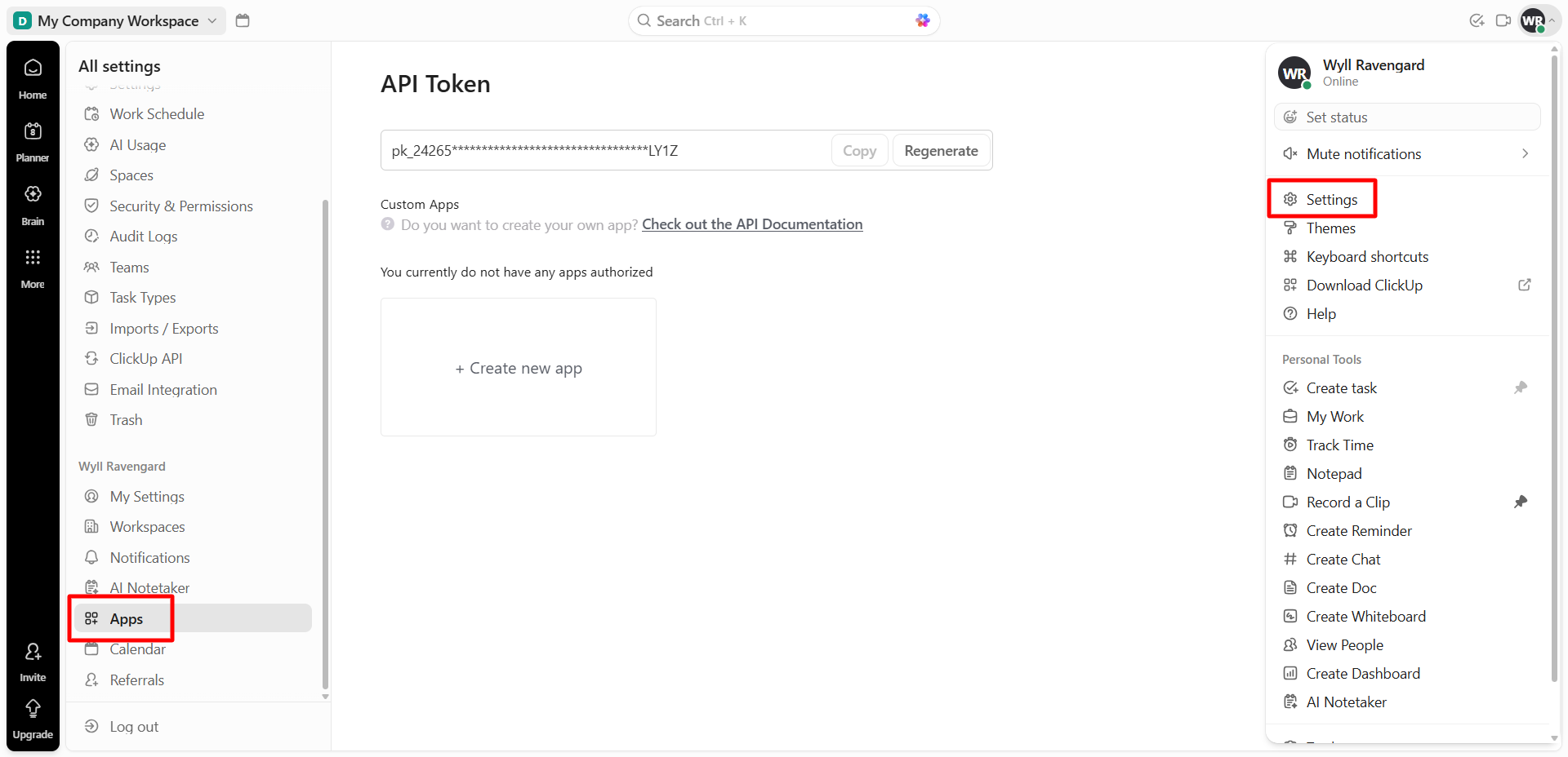 ClickUpをLiveAgentアカウントと連携するには、個人用APIトークンを取得する必要があります。取得するには、ClickUpアカウントのSettings(設定)> Apps(アプリ)に移動し、APIトークンを生成してコピーしてください。