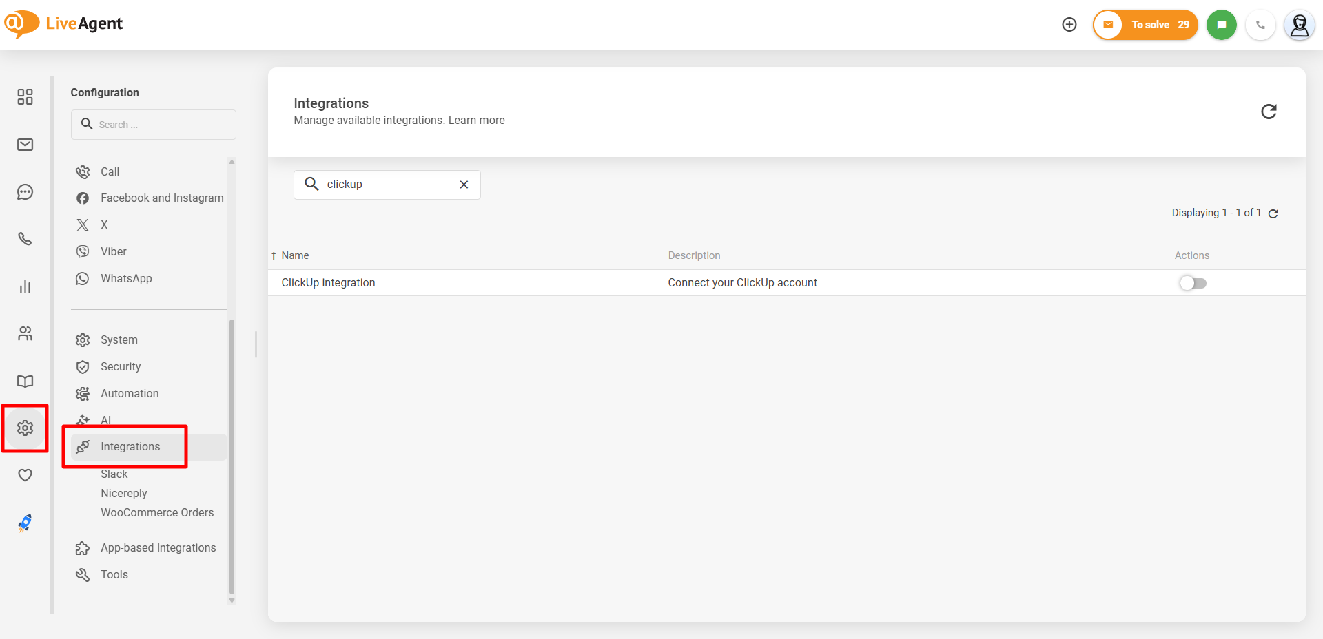 次に、LiveAgentアカウントを開き、Configuration(設定)> Integrations(連携)に移動して、ClickUp連携を検索し、有効化してください。