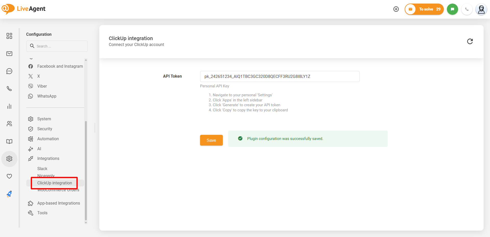 連携が有効になったら、Configuration(設定)> Integration(連携)> ClickUp integrationに移動し、指定されたフィールドにAPIトークンを入力して「Save」(保存)をクリックしてください。