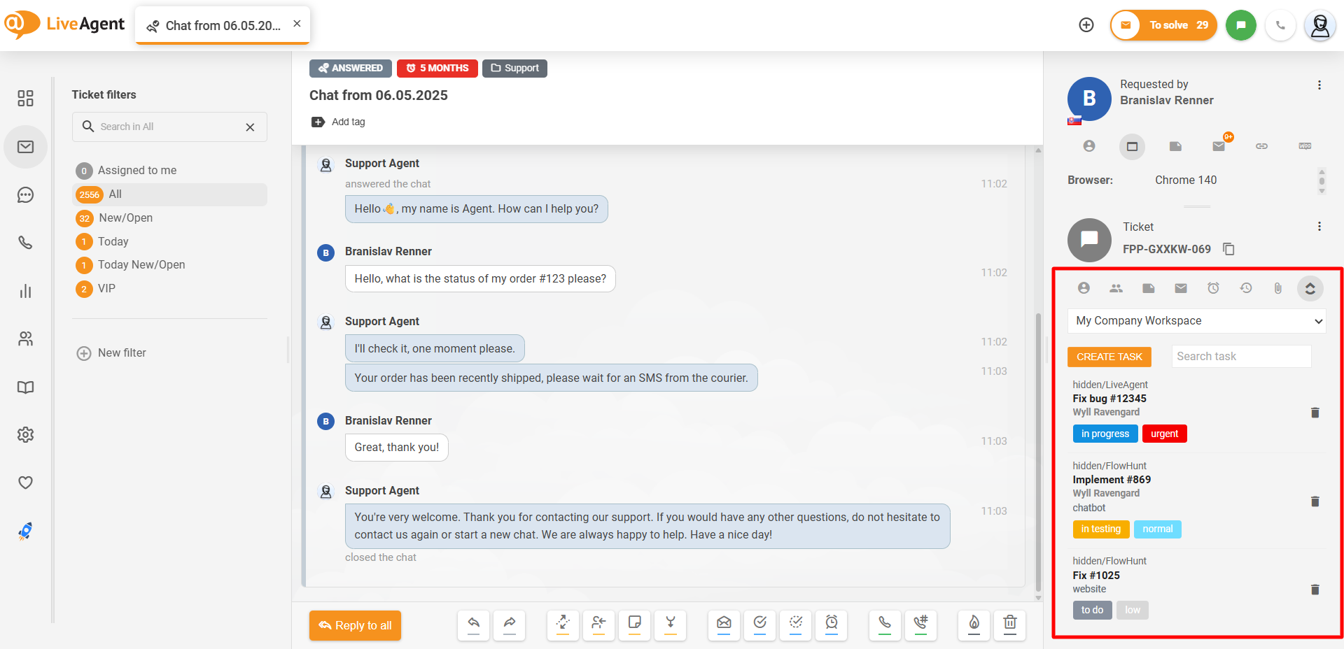 ClickUp連携を使用することで、ClickUpのタスクをチケットにリンクしたり、タスクの詳細を確認したり、LiveAgentから直接新しいタスクを作成したりすることができます。