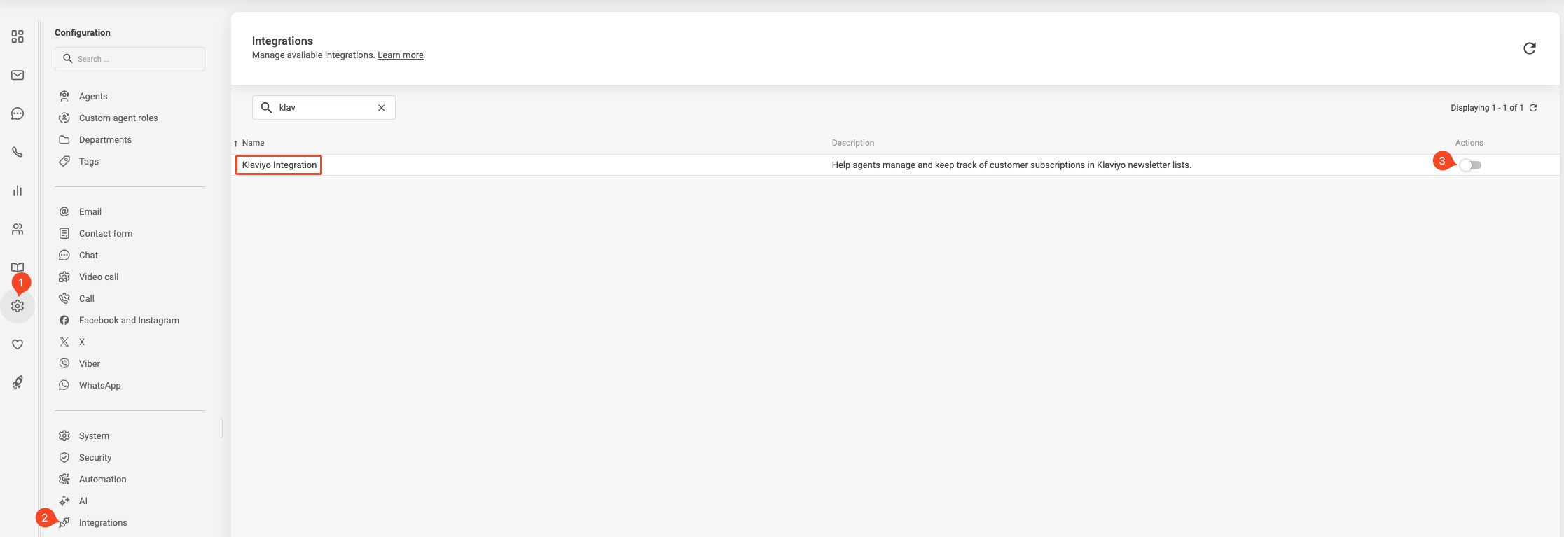 LiveAgentアカウントを開き、“Configuration”(設定)> “Integrations”(インテグレーション)に移動します。Klaviyo Integrationを見つけて有効化します(行末のスイッチをクリックします)。有効化を確認するポップアップが表示されます。確認すると、LiveAgentはページの再読み込みを要求します。“Yes”(はい)ボタンをクリックして再読み込みを確認してください。