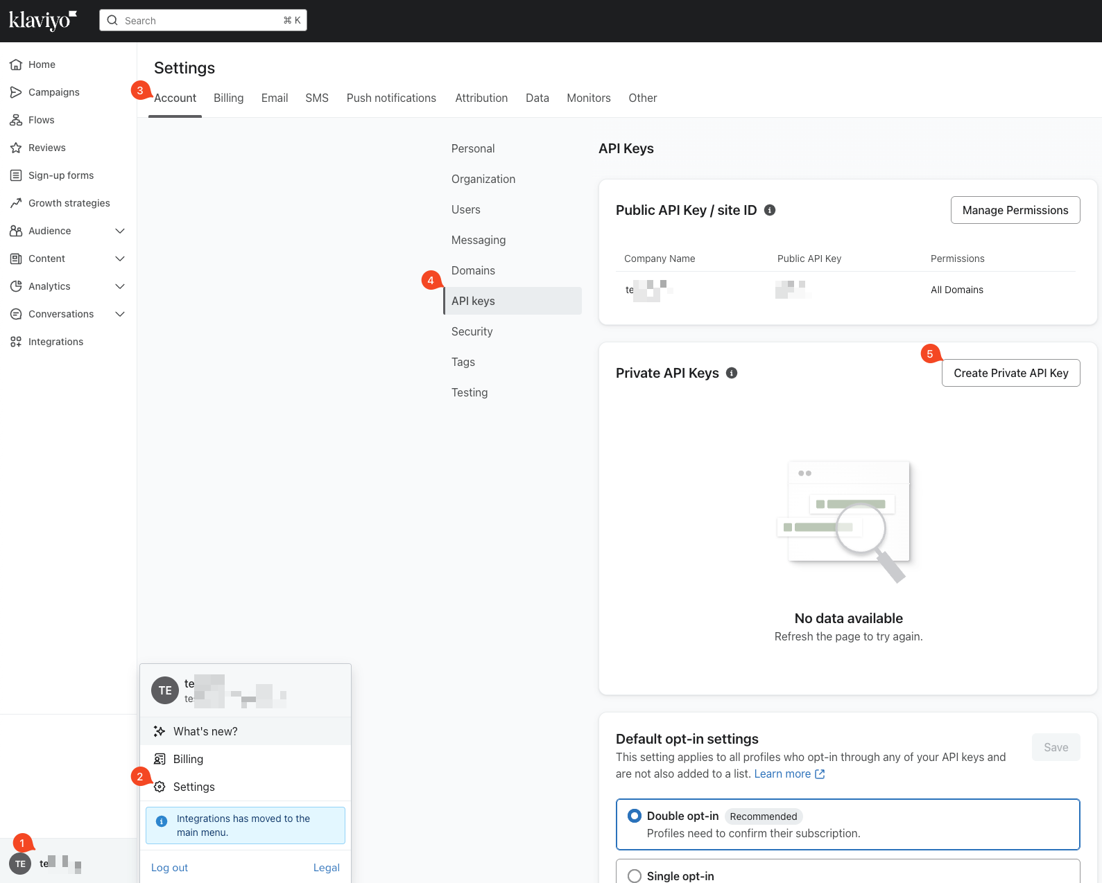 ログインすると、Klaviyoのダッシュボードが開きます。左下隅のユーザー名をクリックすると、新しいコンテキストメニューが開きます。“Settings”(設定)を選択し、“Account”(アカウント)セクションで"API keys"(APIキー)に移動します。“Private API keys”(プライベートAPIキー)の下にある"Create private API Key"(プライベートAPIキーを作成)ボタンをクリックします。