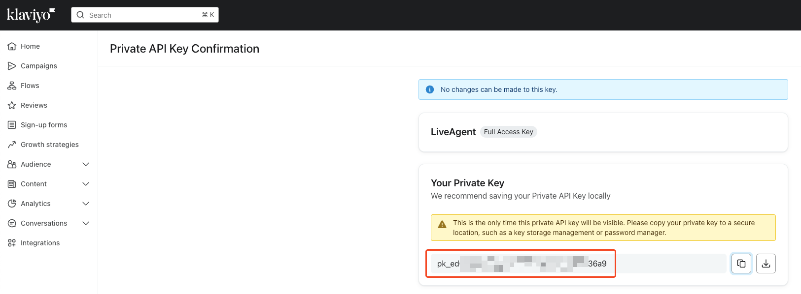 新しいプライベートAPIキーが生成されます。LiveAgent側で連携を行う際に使用するため、コピーしておいてください。