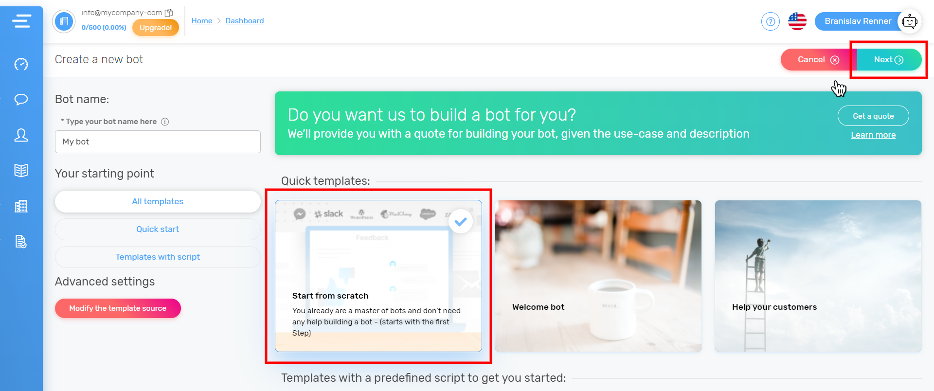 チャットボットに名前を付け、シンプルな「Start from scratch」テンプレートを選択し、「Next」ボタンをクリックして次に進みます。