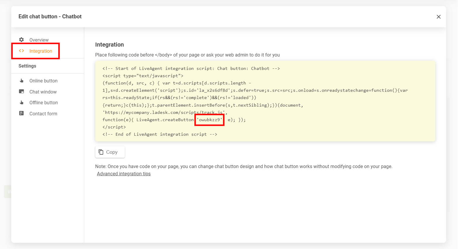 「mycompany.ladesk.com」をお使いのLiveAgentアカウントの実際のドメイン名に置き換え、「BUTTON_ID」をチャットボタンの実際のIDに置き換えることを忘れないでください。チャットボタンのIDは、ボタン設定の「Integration」セクションで確認できます。