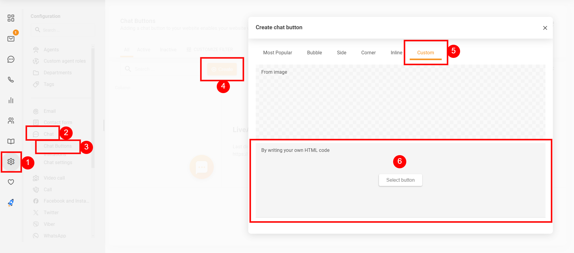 LiveAgentの管理パネルで Configuration(設定) > Chat(チャット) > Chat buttons(チャットボタン) に移動し、「Custom > own HTML code」タイプの新しいボタンを作成します。