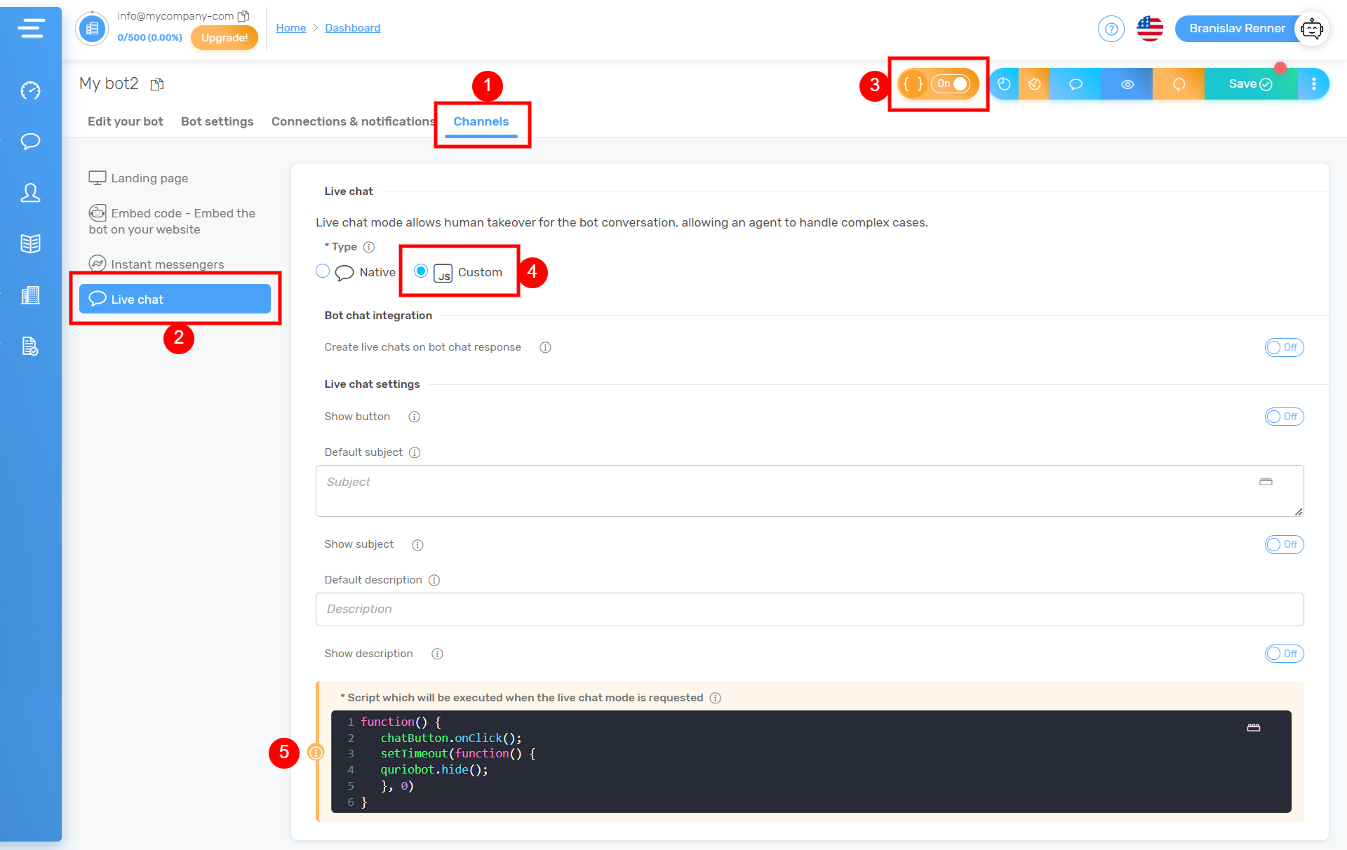 次に、「Channels」タブに移動し、「Live chat」オプションをクリックして、上部のデベロッパーモードを有効にし、ライブチャットチャンネルのタイプをCustomに切り替え、このセクション下部のスクリプトフィールドに以下のスクリプトを追加します。