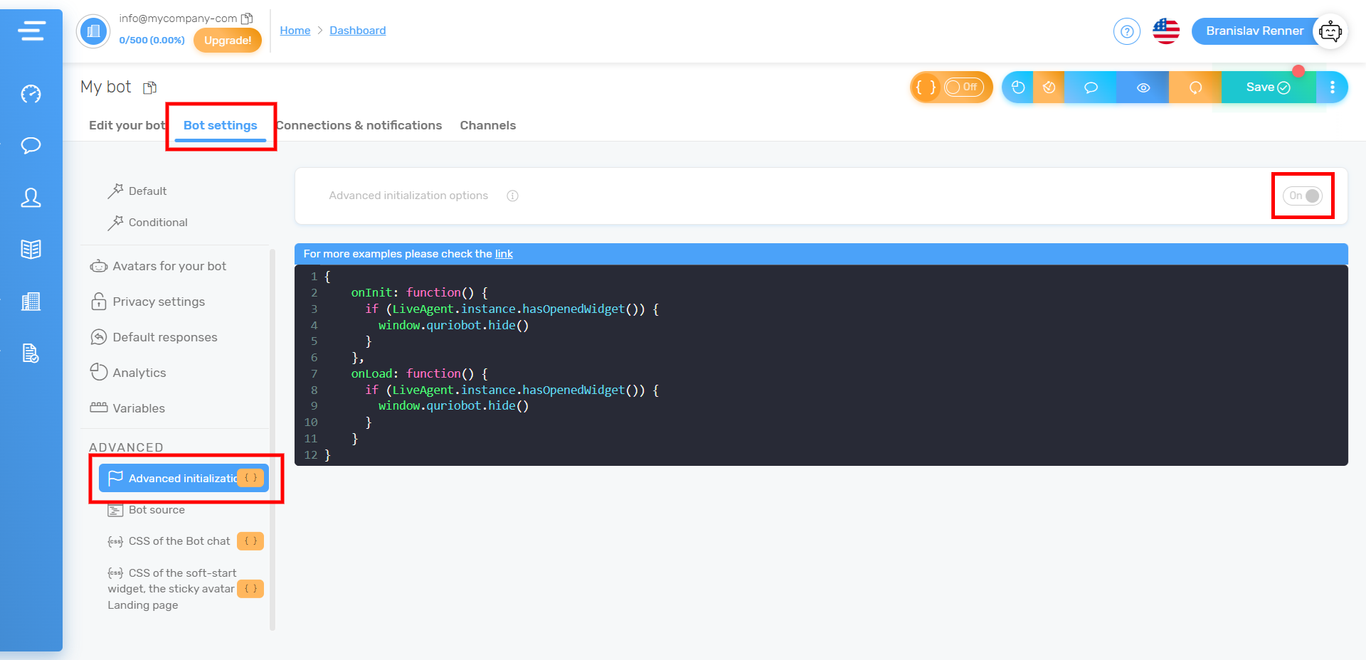 ボットの設定で、Bot settings(ボット設定) > Advanced initialization(高度な初期化)セクションに移動し、「Advance initialization options」を有効にして、以下のコードを指定フィールドに挿入します。
