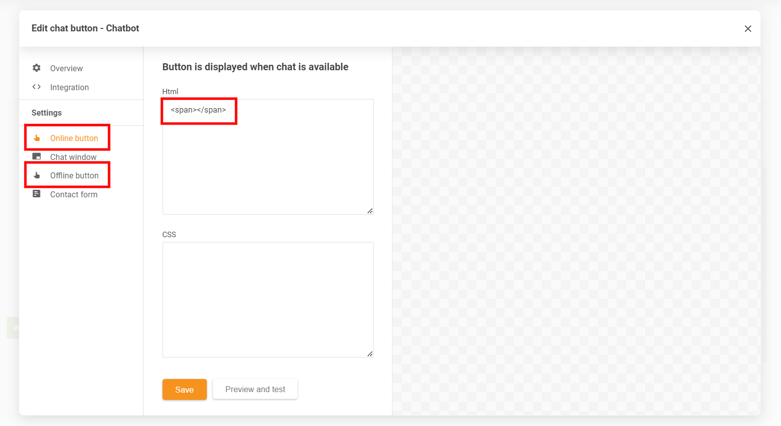 チャットボタンの設定で、「Online button」セクションと「Offline button」セクション(該当する場合)の両方に移動し、HTMLフィールドに以下のコードを挿入します。