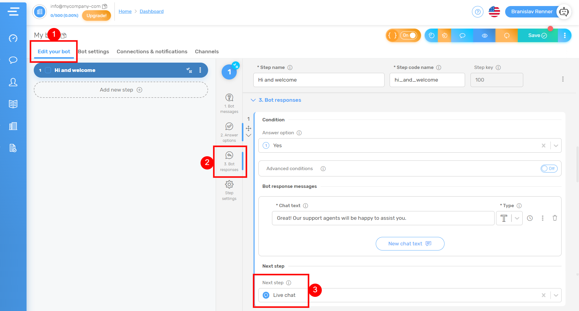 最後のステップとして、ライブチャットを開始するQuriobot側のレスポンスを設定します。そのためには、「Edit your bot」タブのBot responsesセクションに移動し、いずれかのボットレスポンスの次のステップとして「Live chat」を選択します。