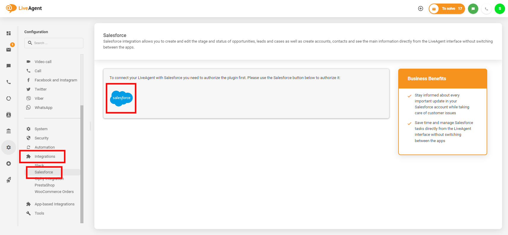 次に、Configuration(設定)> Integrations(連携)> Salesforceに移動し、「Salesforce」ボタンをクリックして、SalesforceアカウントとLiveAgentアカウントを接続します。