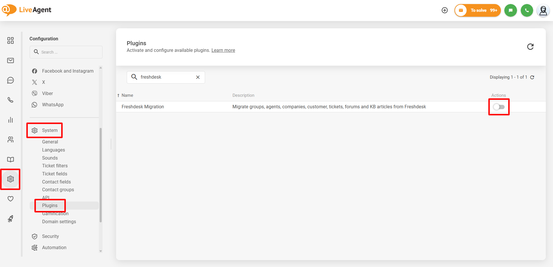 LiveAgentのエージェントパネルで Configuration > System > Plugins に移動します。「Freshdesk Migration」 プラグインを見つけ、隣にある 「Activate」(有効化) ボタンをクリックします。