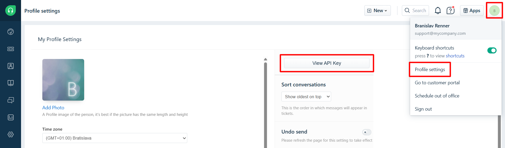 FreshdeskのデータをLiveAgentに移行するには、Freshdesk APIキーを取得する必要があります。取得するには、Freshdeskのプロフィール設定に移動し、「View API key」をクリックしてください。詳細についてはこちらのFreshdeskの記事をご覧ください。
