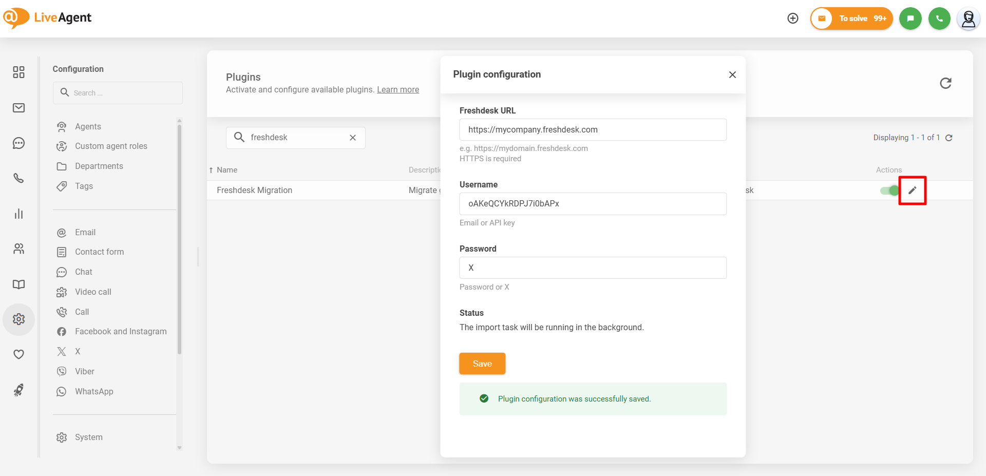 プラグインを有効化してパネルを更新したら、Configure(鉛筆アイコン)ボタンをクリックしてプラグインを設定します。設定ウィンドウで、「Freshdesk URL」フィールドにFreshdeskのドメインを入力し、「Username」フィールドにコピーしたFreshdesk APIキーを入力し、「Password」フィールドにXを入力します。「Save」(保存)ボタンをクリックして移行を開始します。