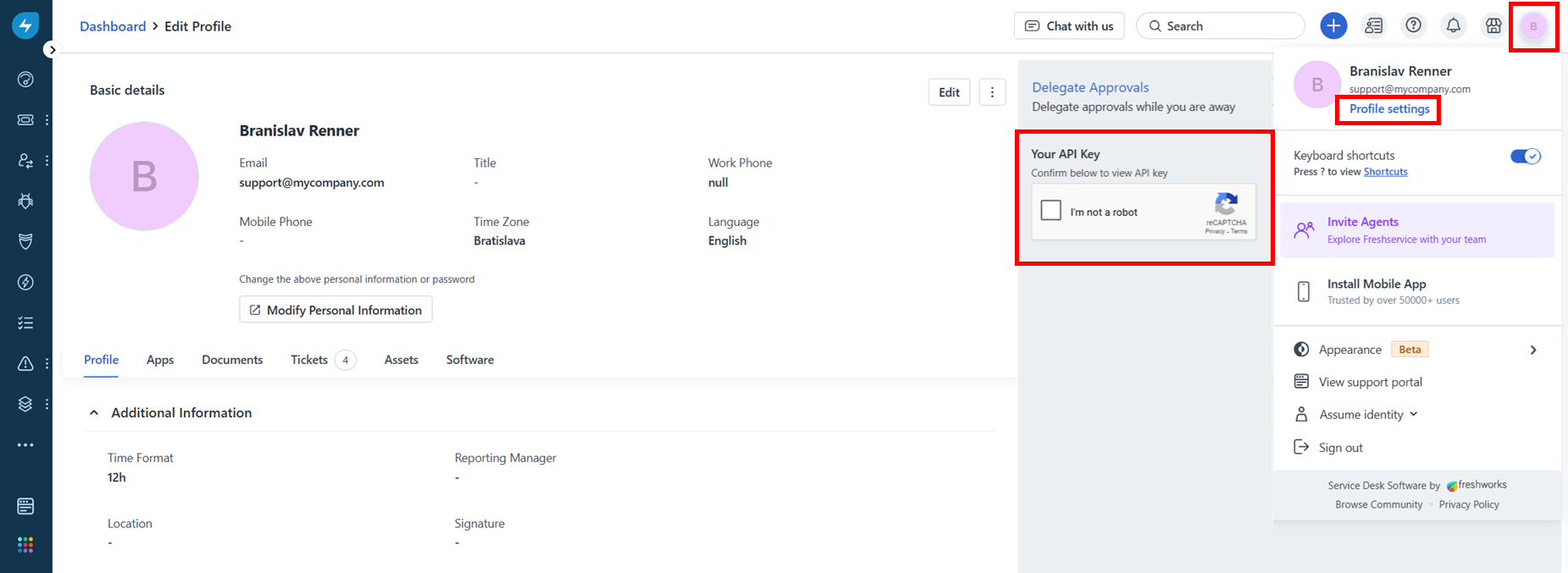 FreshserviceのデータをLiveAgentに移行するには、FreshserviceのAPIキーを取得する必要があります。取得するには、Freshserviceのプロフィール設定に移動し、「View API key」をクリックしてください。詳細についてはこちらのFreshserviceの記事をご参照ください。