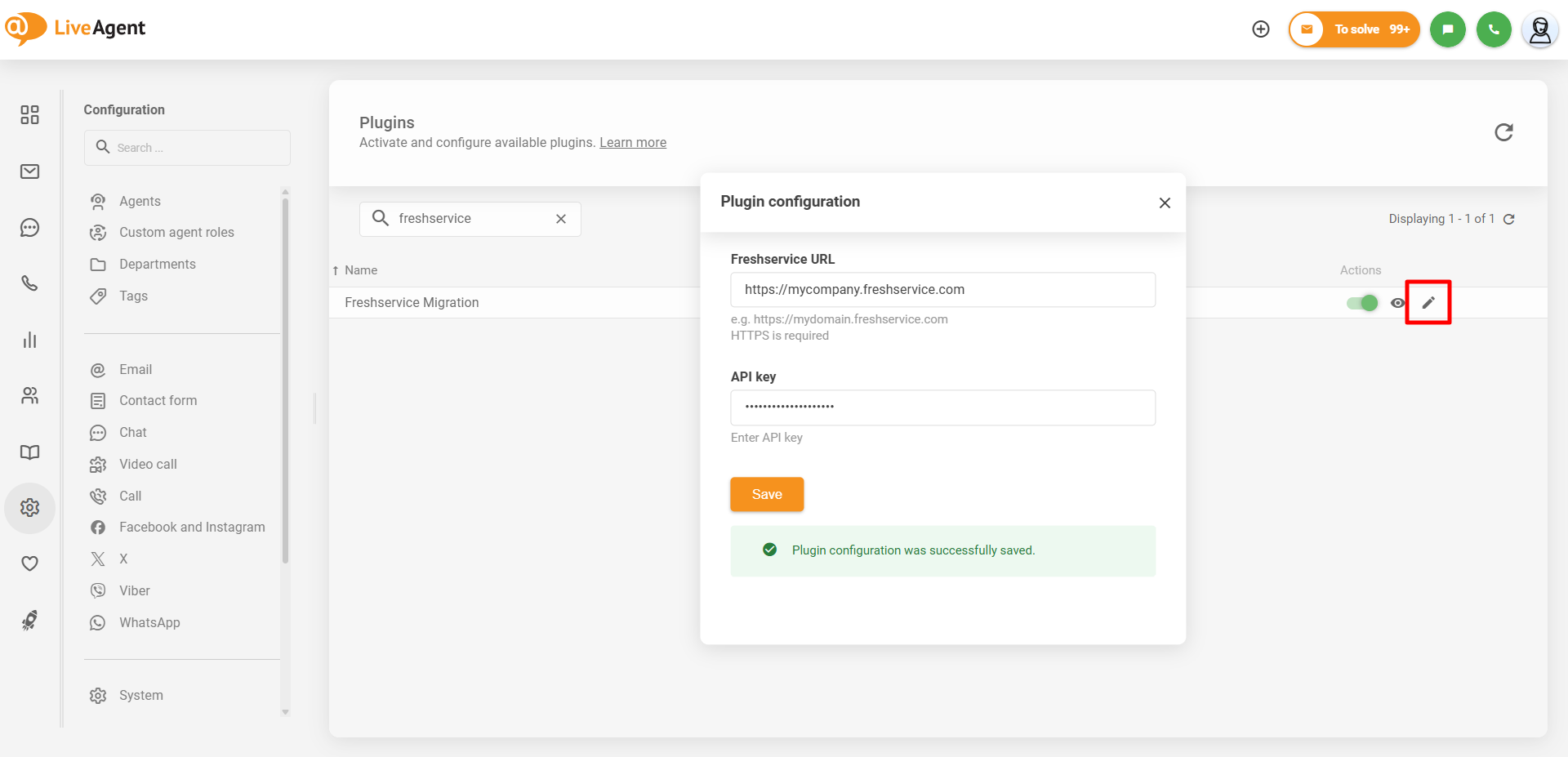 プラグインを有効化してパネルを更新したら、Configure(鉛筆アイコン)ボタンをクリックしてプラグインを設定します。設定ウィンドウで、「Freshservice URL」フィールドにFreshserviceのドメインを入力し、「API key」フィールドにコピーしたFreshserviceのAPIキーを入力します。「Save」ボタンをクリックして移行を開始します。