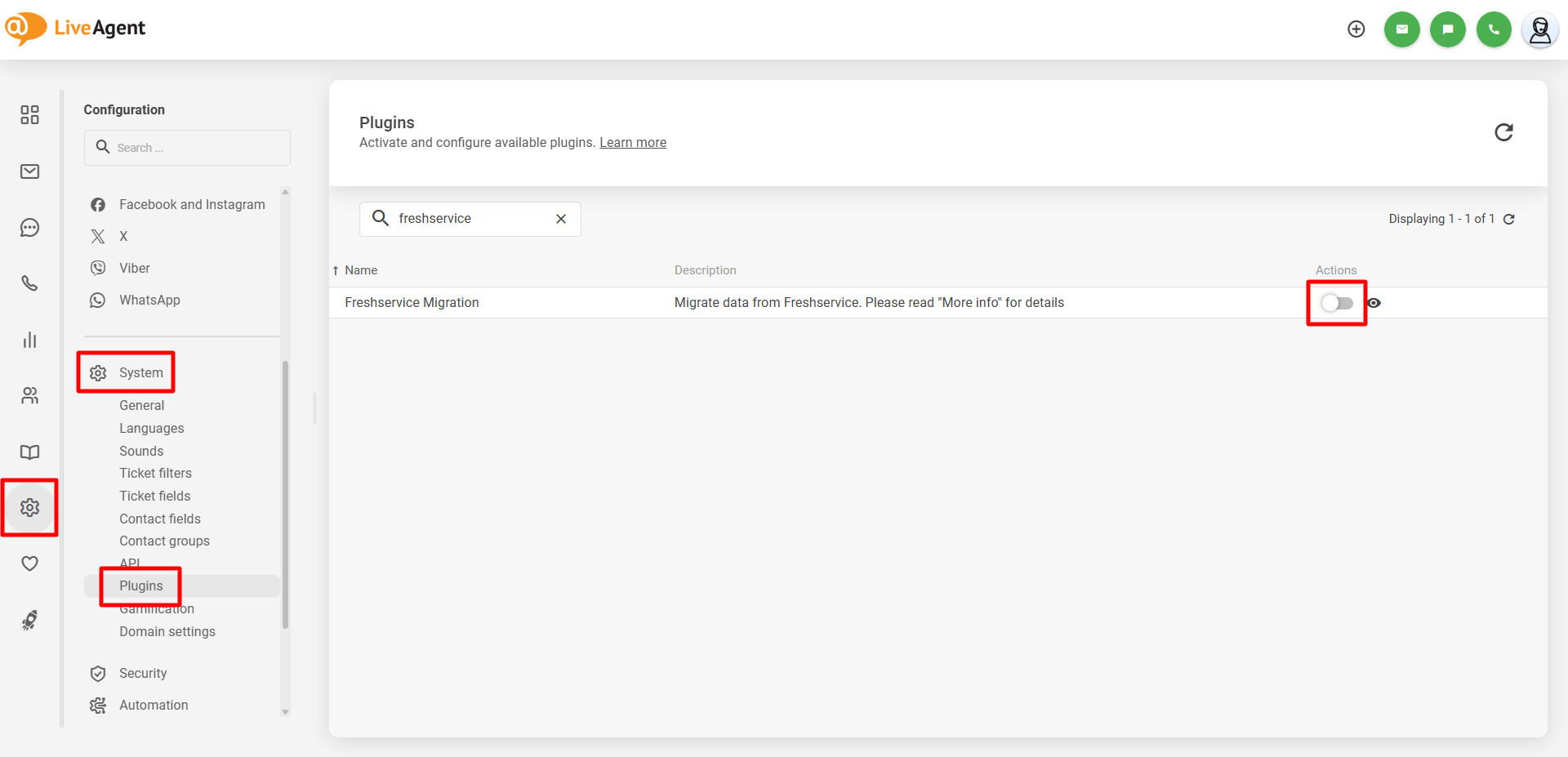 LiveAgentのエージェントパネルで Configuration > System > Plugins に移動します。「Freshservice Migration」 プラグインを見つけ、その横にある 「Activate」 ボタンをクリックします。