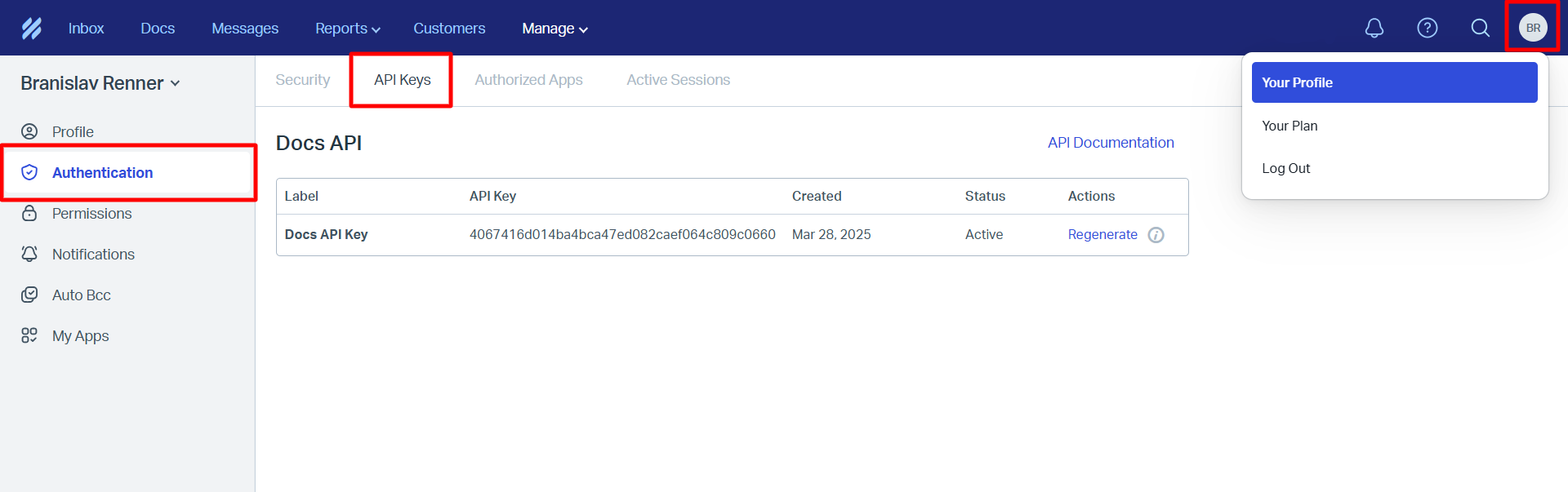 APIキーを取得するには、Help Scoutパネルの右上にあるプロフィール画像をクリックし、“Your Profile”(プロフィール)メニュー項目をクリックして、Authentication > API Keys セクションに移動します。
