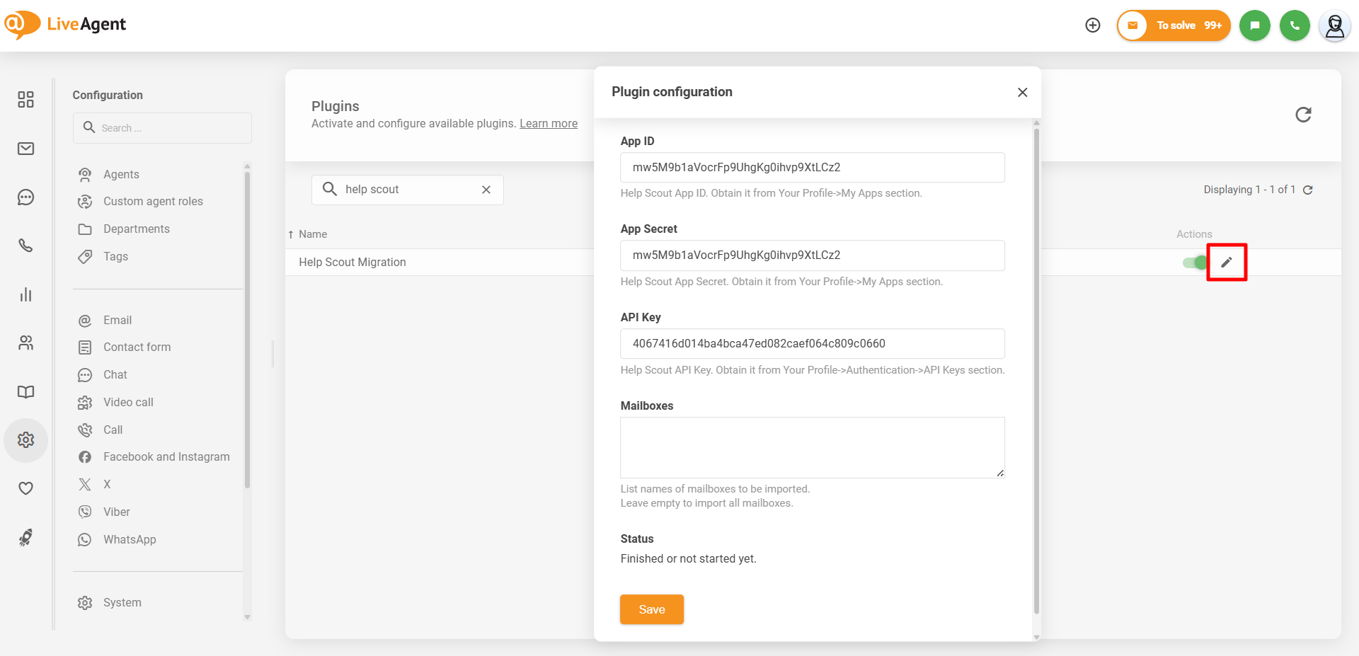プラグインを有効化してパネルを更新したら、Configure(設定)ボタン(鉛筆アイコン)をクリックしてプラグインの設定を行います。設定ウィンドウで、カスタムHelp ScoutアプリのApp IDとApp Secret、およびHelp Scout APIキーをそれぞれの入力欄に入力します。特定のHelp Scout受信ボックスからのみチケットを移行したい場合は、“Mailboxes”(メールボックス)フィールドにその名前をカンマ区切りで入力してください。入力がない場合は、すべての受信ボックスのチケットが移行されます。“Save”(保存)ボタンをクリックして移行を開始します。