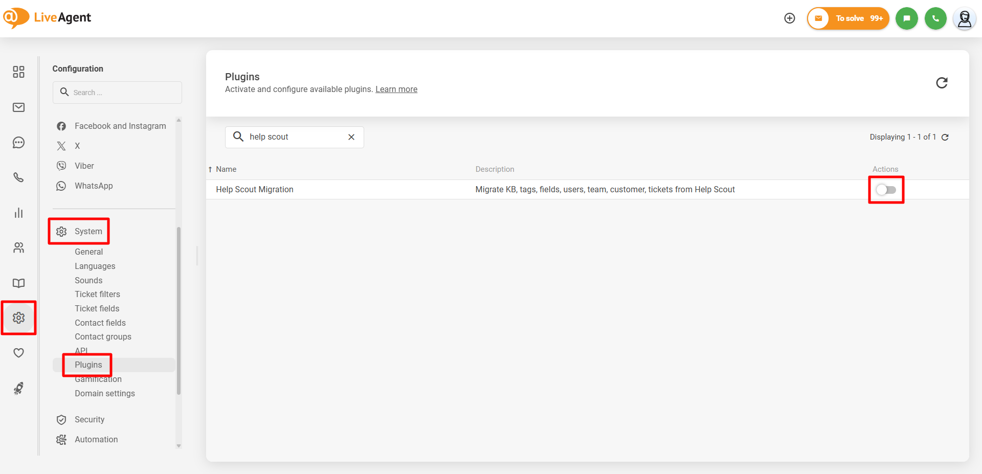 LiveAgentエージェントパネルで Configuration(設定) > System(システム) > Plugins(プラグイン) に移動します。“Help Scout Migration” プラグインを見つけ、その横にある “Activate”(有効化) ボタンをクリックします。