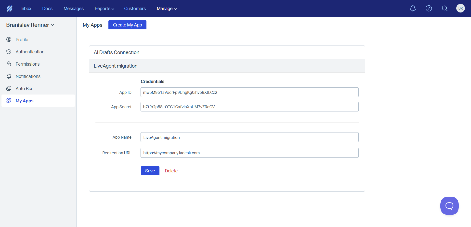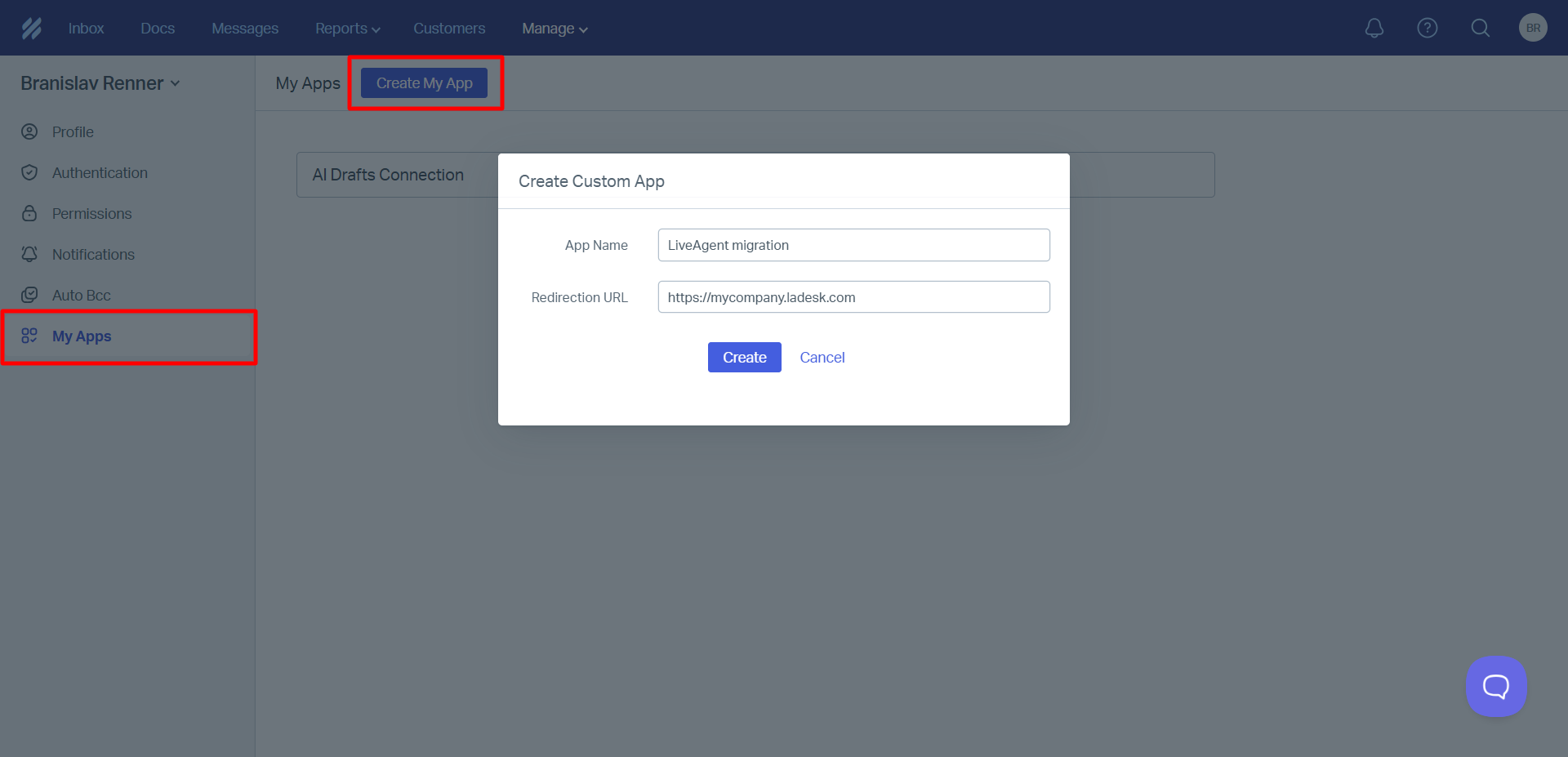 カスタムHelp Scoutアプリを作成するには、引き続きプロフィール内の “My Apps”(マイアプリ)セクションに移動します。“Create My App”(アプリを作成)ボタンをクリックし、アプリ名を入力して、リダイレクトURLとしてLiveAgentアカウントのURLアドレスなどを入力します。