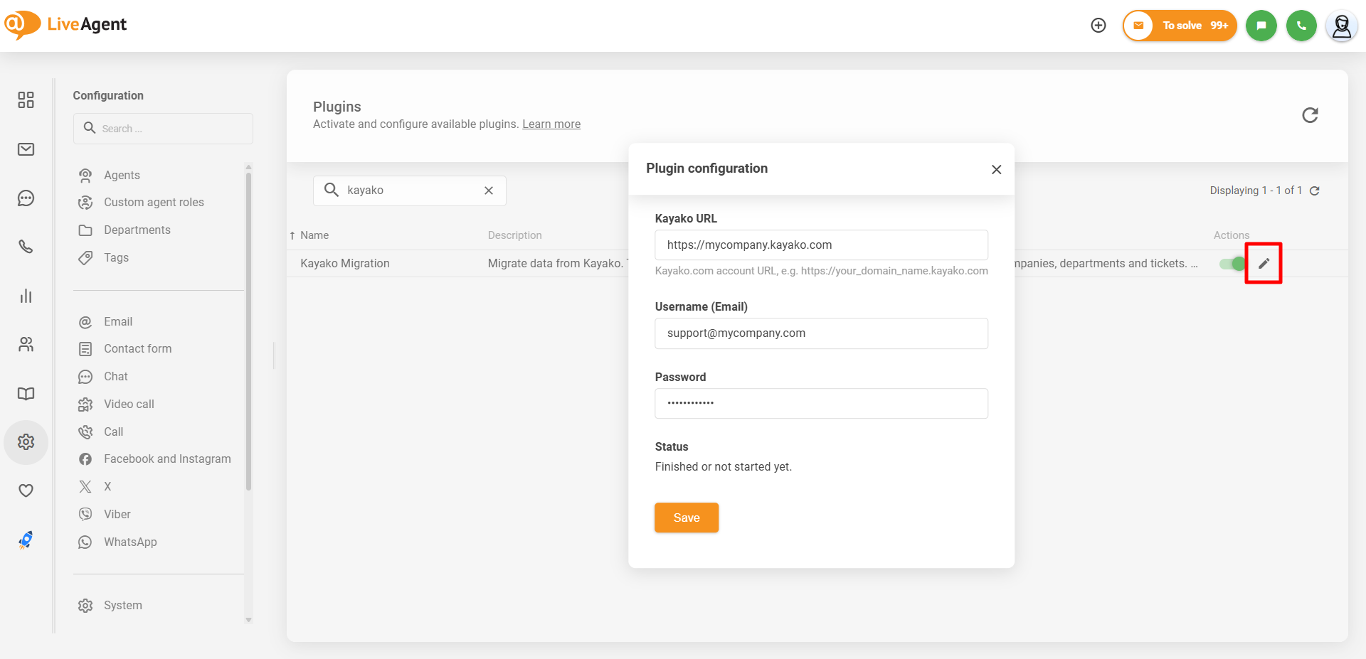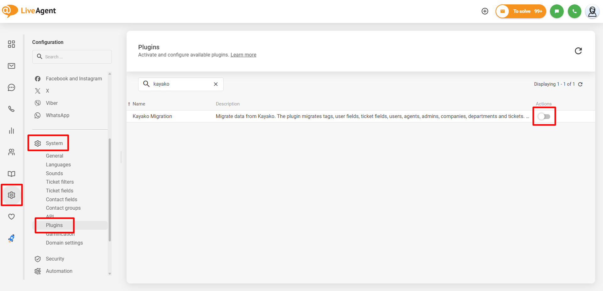Kayakoアカウントからデータを移行するには、LiveAgentパネルで Configuration(設定) > System(システム) > Plugins(プラグイン) に移動し、「Kayako Migration」プラグインを検索して有効化します。