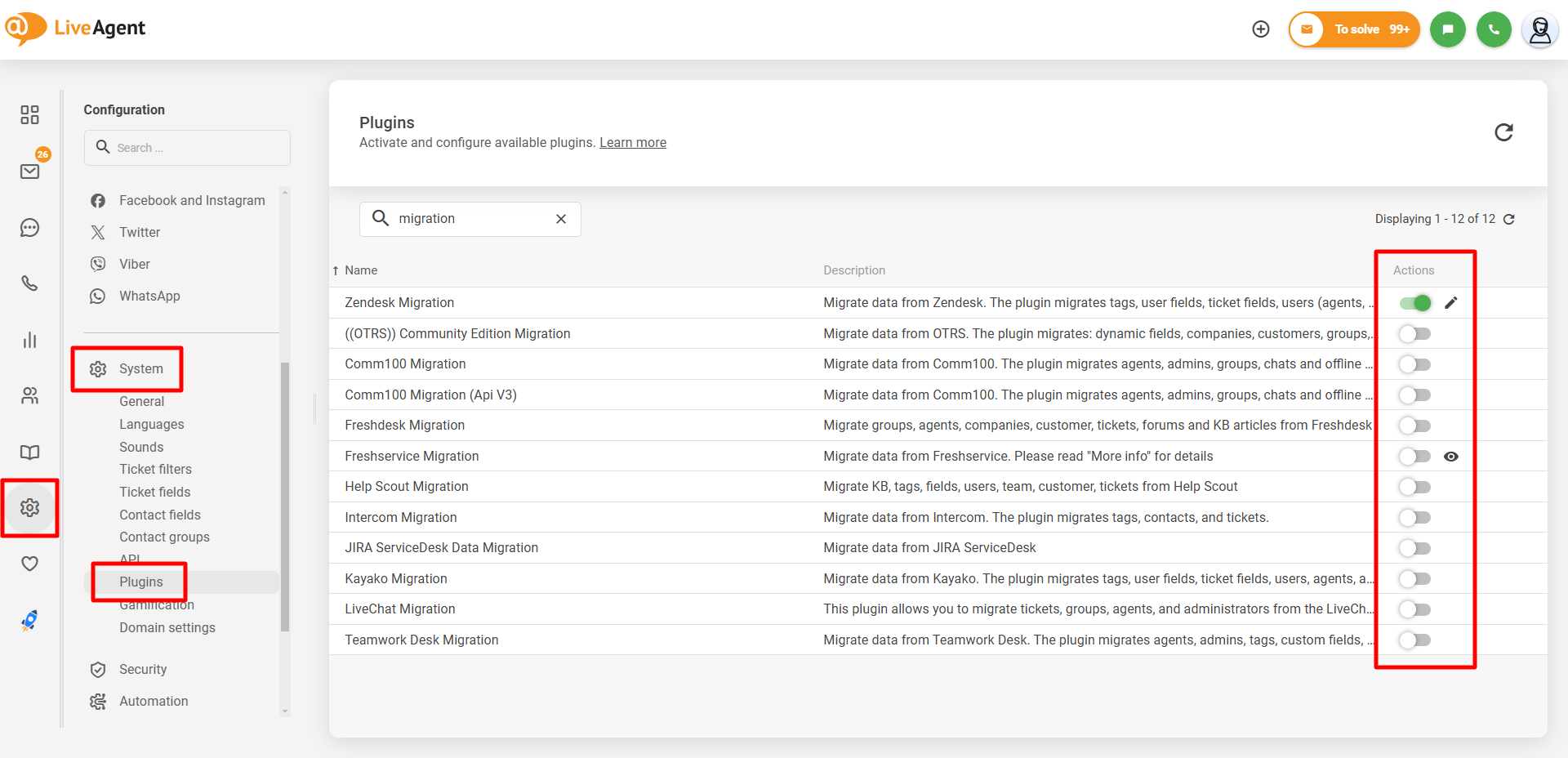 移行を開始するには、LiveAgentパネルにログインし、Configuration(設定)> System(システム)> Plugins(プラグイン)に移動して、現在お使いのヘルプデスクプラットフォームに対応した移行プラグインを検索し、有効化してください。