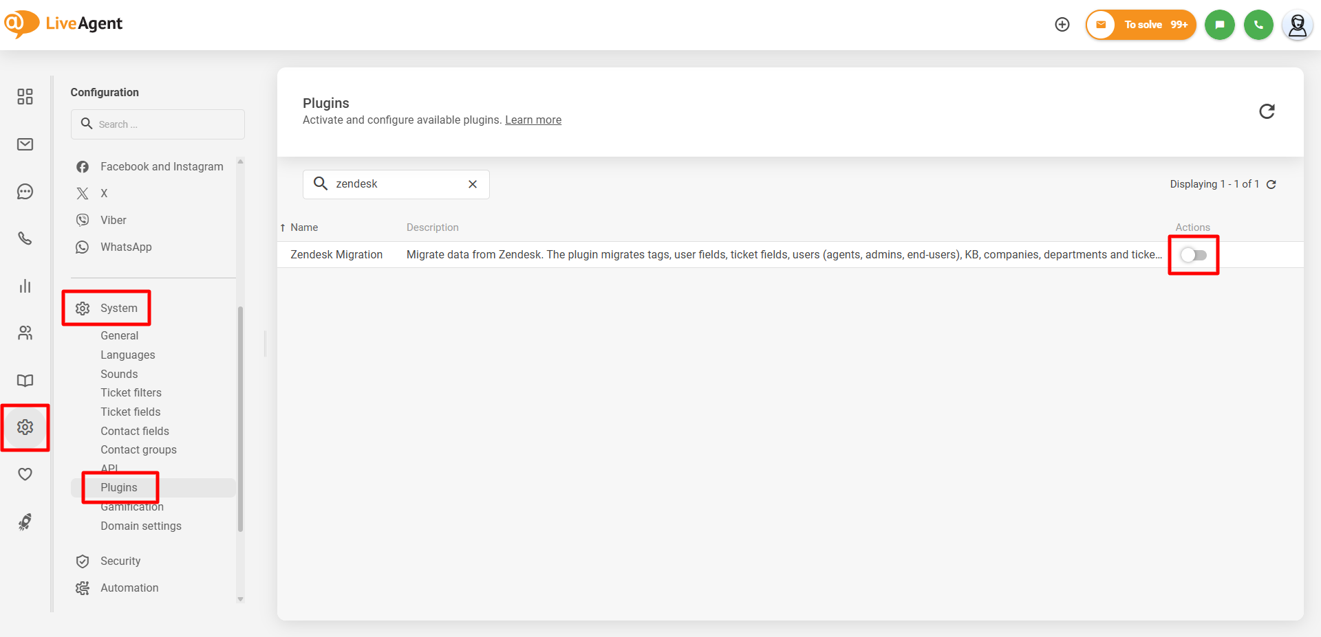 LiveAgentエージェントパネルで Configuration(設定)> System(システム)> Plugins(プラグイン) に移動します。「Zendesk Migration」 プラグインを見つけ、横にある 「Activate」(有効化) ボタンをクリックします。