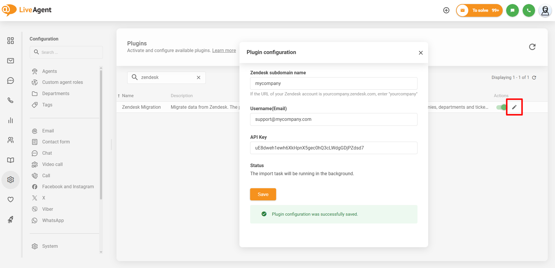 プラグインを有効化してパネルを更新したら、Configure(設定)ボタン(鉛筆アイコン)をクリックしてプラグインを設定します。設定ウィンドウで、Zendeskのサブドメイン名、Zendeskのログインユーザー名、およびAPIキーをそれぞれの入力欄に入力してください。「Save」(保存)ボタンをクリックすると、移行が開始されます。