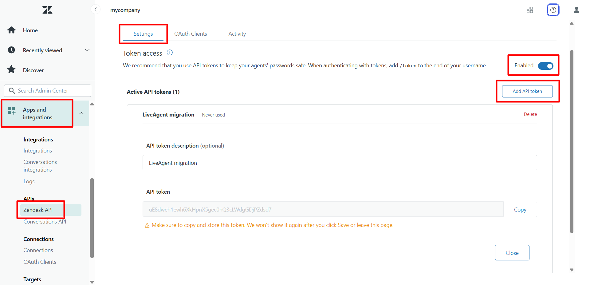 ZendeskのデータをLiveAgentに移行するには、Zendesk APIキーの作成が必要です。作成するには、Zendeskパネルで Admin Center(管理センター)> Apps and integrations(アプリと統合)> Zendesk API に移動し、「Settings」(設定)タブで「Token access」(トークンアクセス)オプションを有効にして、新しいAPIトークンを追加してください。Zendesk APIキーの詳細については、こちらのZendeskの記事をご参照ください。