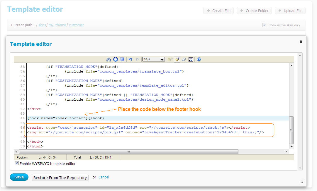 続いて、index.tplファイルをクリックして編集し、コピーしたチャットボタンのコードを貼り付けます。変更を保存すれば設定完了です。