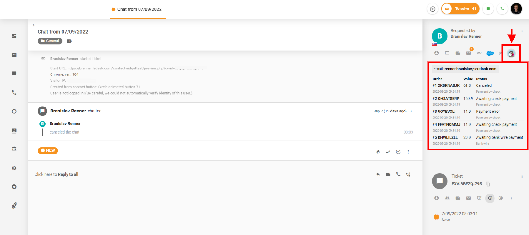 PrestaShopプラグインを使用すると、PrestaShopストアの注文をLiveAgent内で直接確認できます。具体的には、顧客詳細セクションに注文情報が表示されます。また、任意の注文IDをクリックすると、新しいブラウザタブでPrestaShopの注文詳細を直接開くことも可能です。