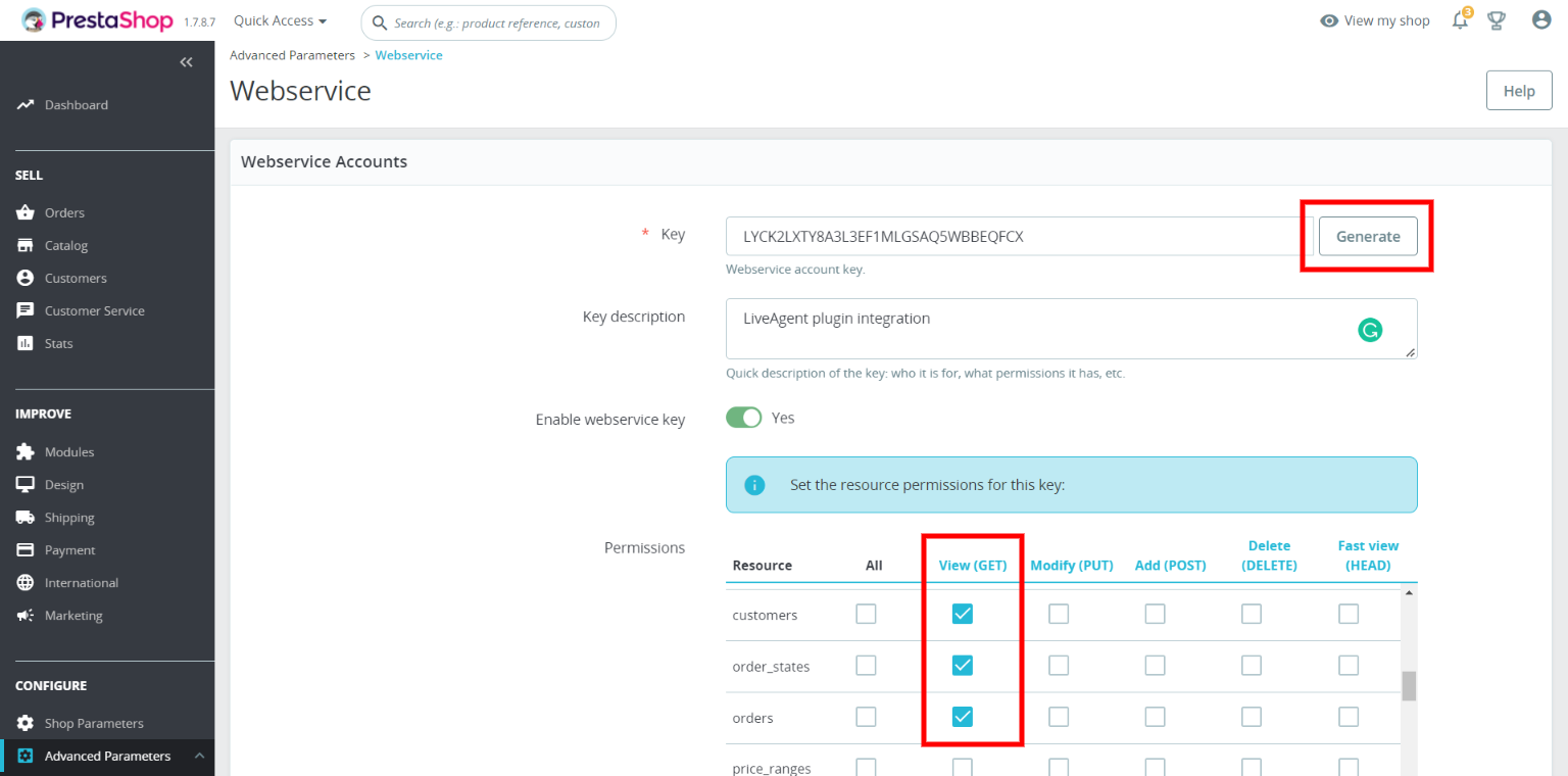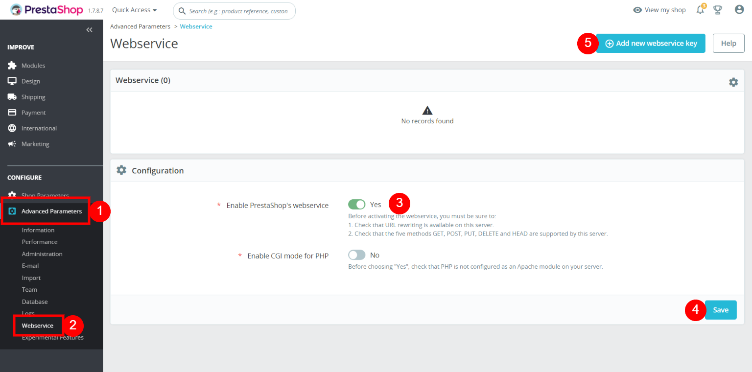 LiveAgentアカウントをPrestaShopと連携するには、まずPrestaShop管理パネルで「Advanced Parameters」(詳細パラメータ) > 「Webservice」(ウェブサービス)に移動します。「Configuration」(設定)セクションで「Enable PrestaShop’s webservice」(PrestaShopウェブサービスを有効にする)を「Yes」(はい)に切り替えて設定を保存します。その後、「Add new webservice key」(新しいウェブサービスキーを追加)ボタンをクリックします。