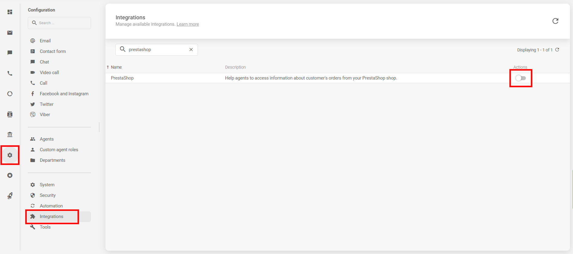 LiveAgentアカウントで「Configuration」(設定) > 「Integrations」(連携)に移動し、「PrestaShop」連携を検索して有効化し、必要な再読み込みを確認します。