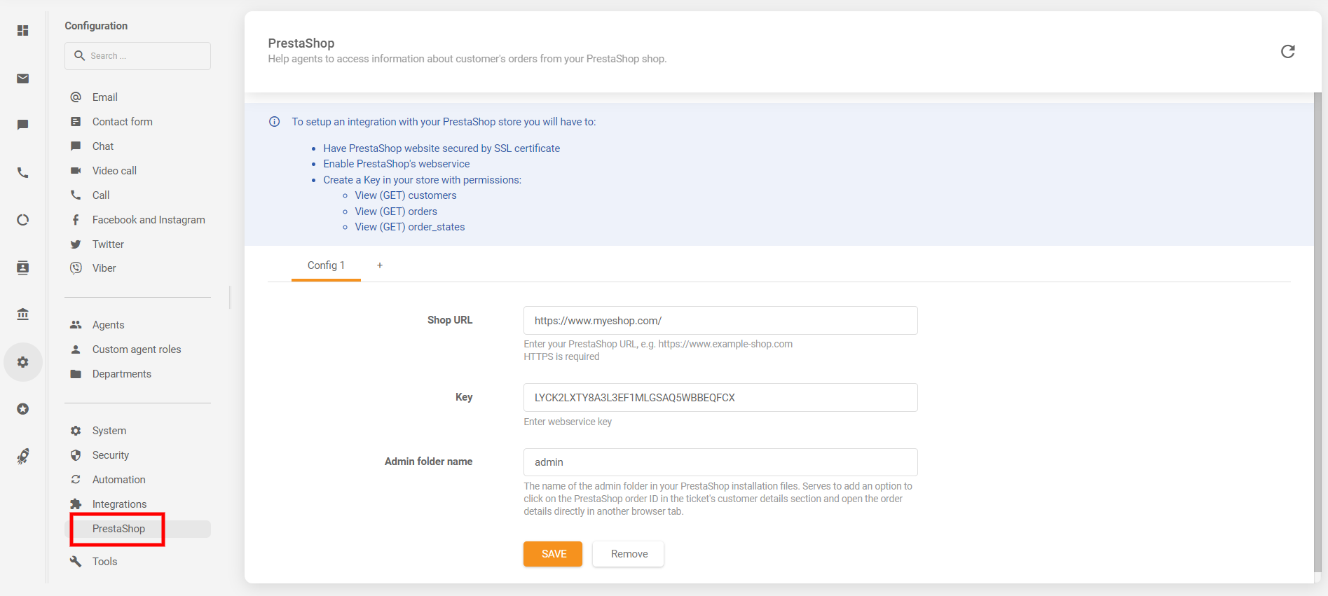 パネルが再読み込みされたら、「Configuration」(設定) > 「Integrations」(連携) > 「PrestaShop」に移動します。設定ウィンドウで以下の情報を入力します: