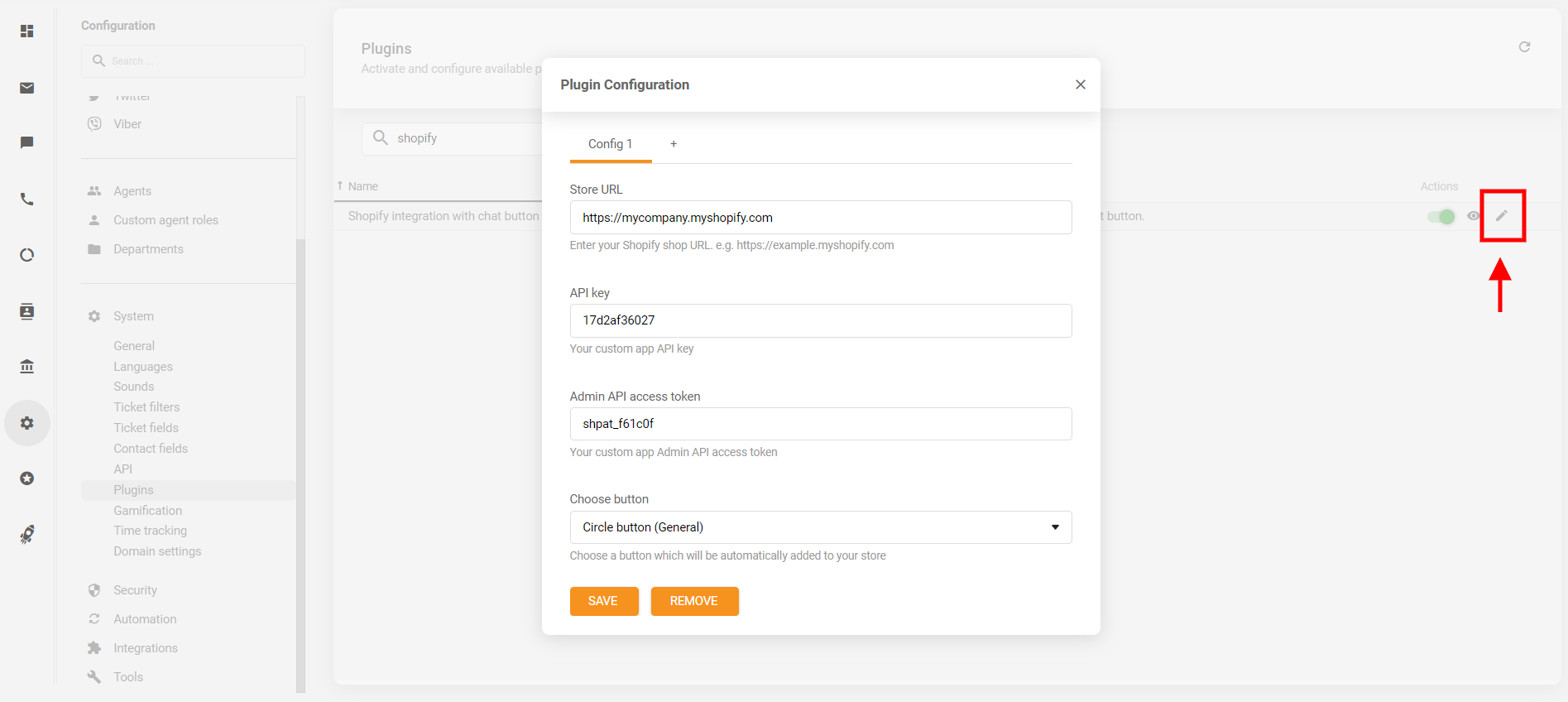 LiveAgentパネルで、Configuration(設定) > System(システム) > Plugins(プラグイン)に移動し、「Shopify integration with chat button」プラグインを検索して有効化します。