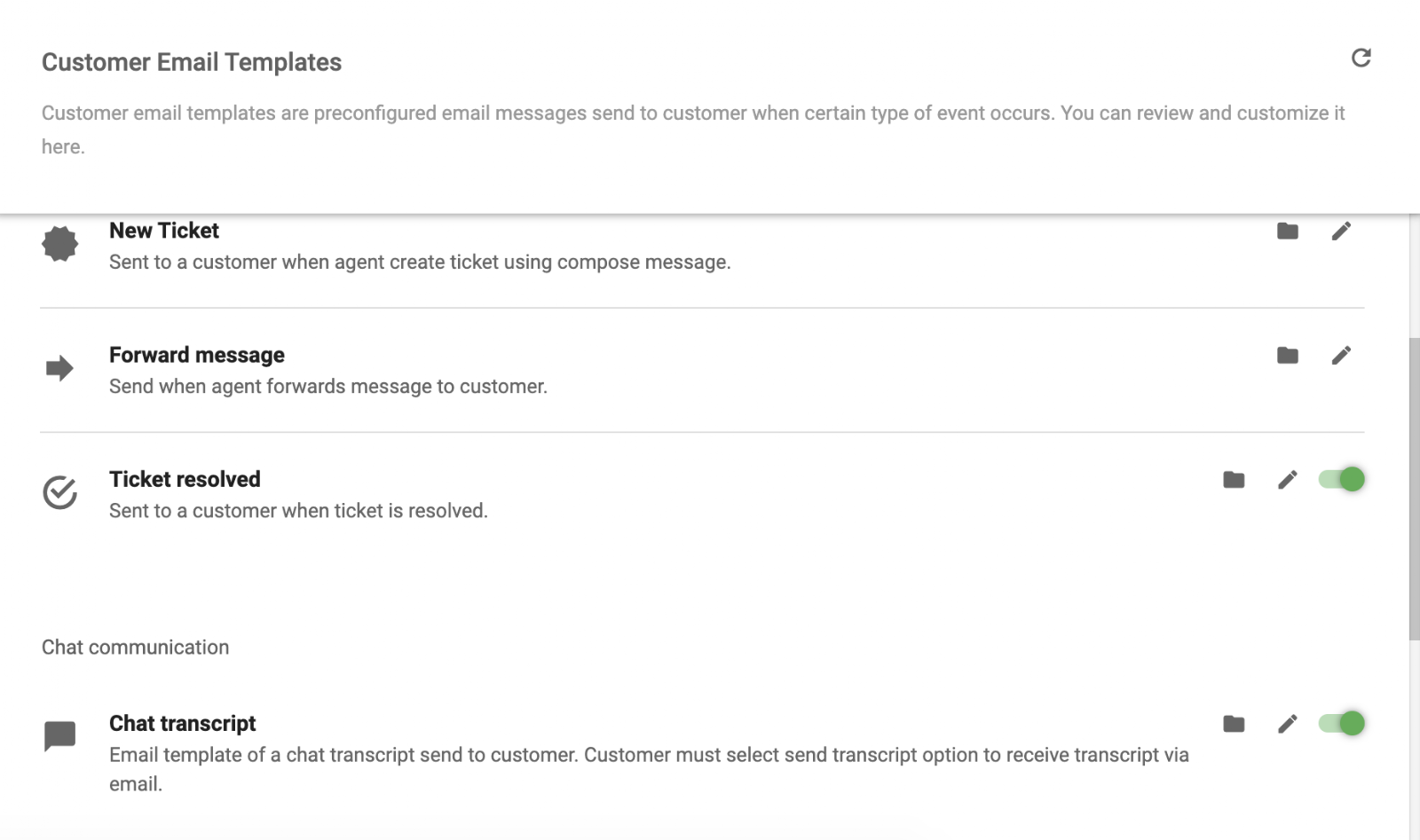 - 次に、LiveAgentを開き、Configuration > Email > Customer templates(設定 > メール > 顧客テンプレート)に移動します。リストからTicket Resolved(チケット解決済み)を選択し、お好みの場所にコードを貼り付けます。顧客にフィードバックを求める一言を添えることもできます。テンプレートの設定が完了したら、Save(保存)をクリックします。顧客に送信する前に、テンプレートをテストして表示を確認することもできます。