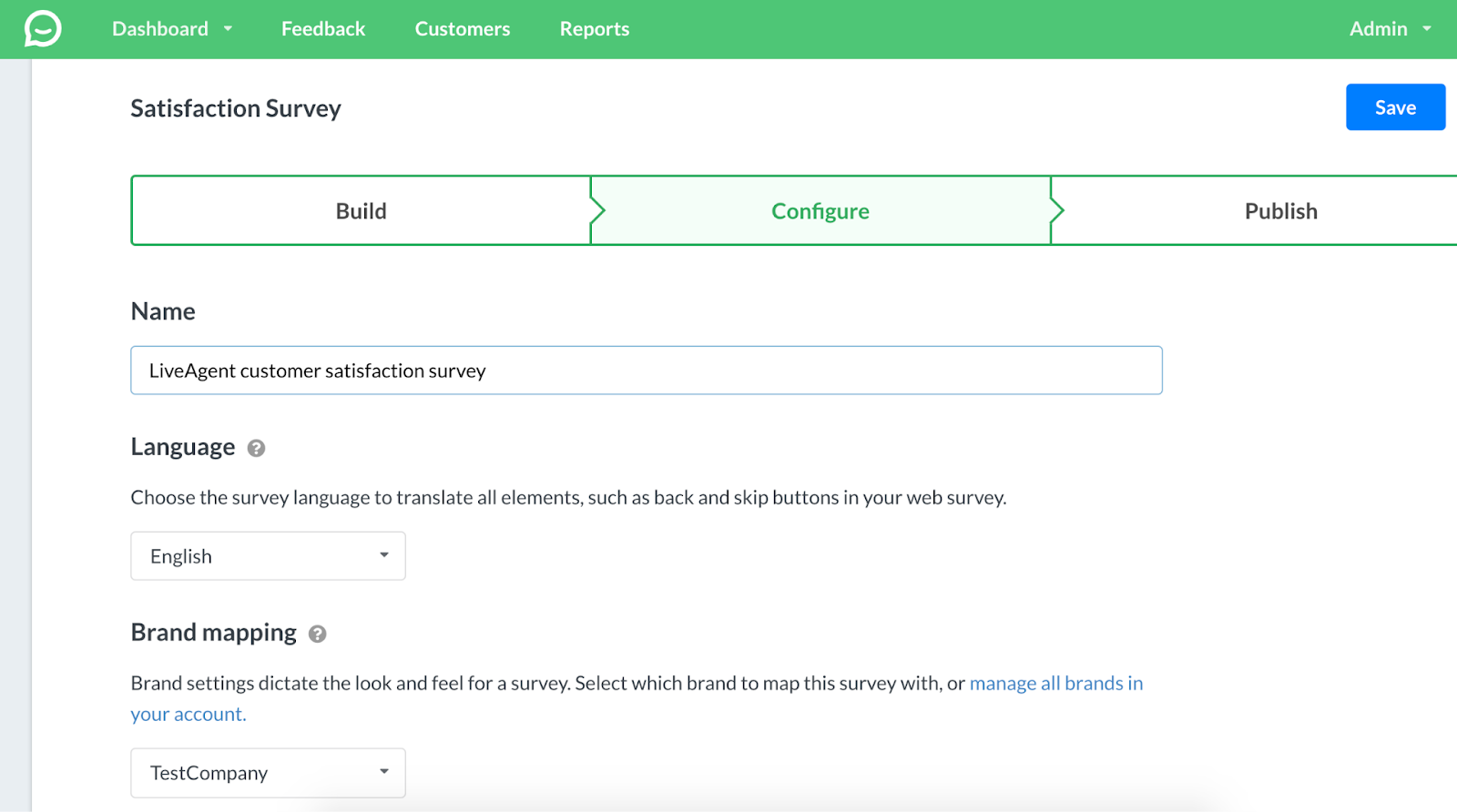 - アンケートの設定が完了したら、次のセクション「Configure」に進みます。調査の名前と言語を選択できます。Simplesatは選択した言語にアンケートを自動翻訳します。Open tickets directly in your help desk(ヘルプデスクでチケットを直接開く)オプションの下に、LiveAgentヘルプデスクのリンクを入力してください。