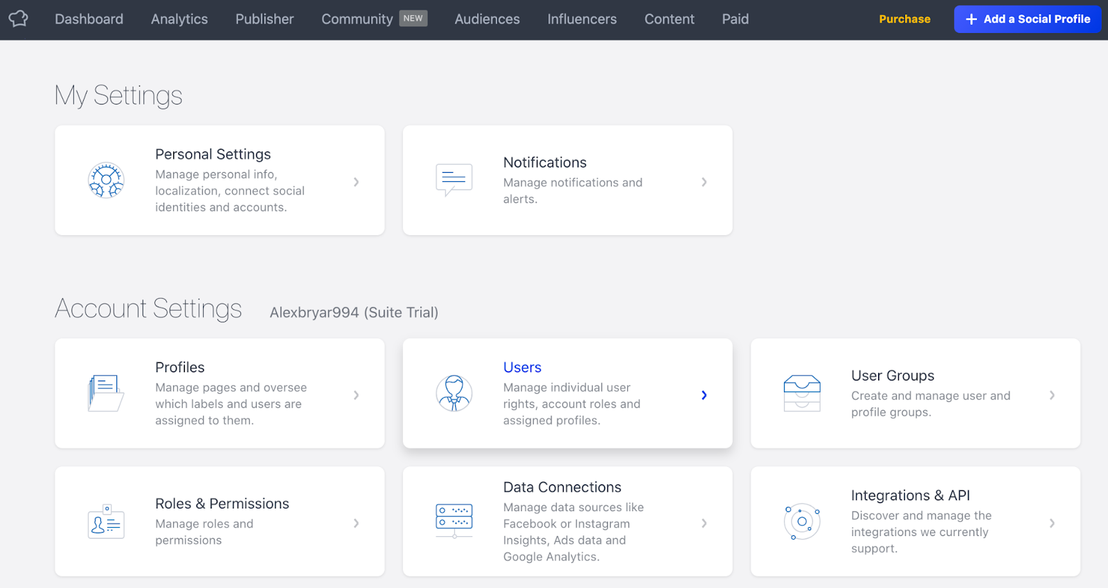 - SocialBakers のダッシュボードにアクセスし、右上のプロフィール画像の横にある小さな矢印をクリックします。次に、Settings(設定)> Users(ユーザー)に移動し、LiveAgent の認証情報とメールアドレスを持つ新しいユーザーを追加します。この新しいユーザーを次のステップのために保存してください。