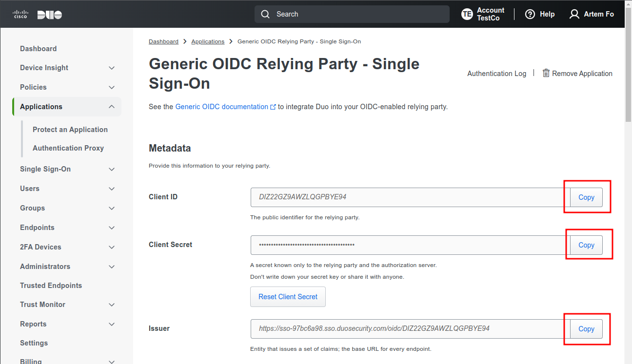 アプリを保存したら、Client ID、Client Secret、Issuerをコピーします。LiveAgentパネルに戻り、コピーしたClient ID、Client Secret、IssuerをDuo連携設定フォームの対応するフィールドにそれぞれ貼り付けます。