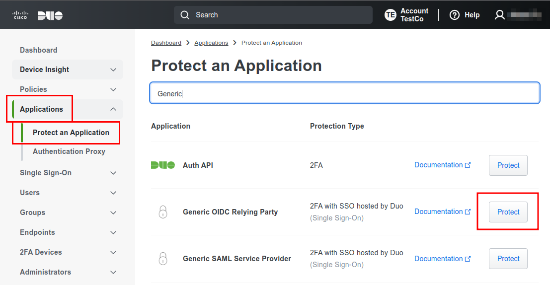 DuoアカウントをLiveAgentと連携するには、https://admin.duosecurity.com/login にアクセスしてDuoアカウントにログインします。ログイン後、左メニューから「Applications」>「Protect an Application」に移動し、アプリケーション一覧の中から保護タイプが「2FA with SSO hosted by Duo (Single Sign-On)」となっている「Generic OIDC Relying Party」の「Protect」ボタンをクリックします。
