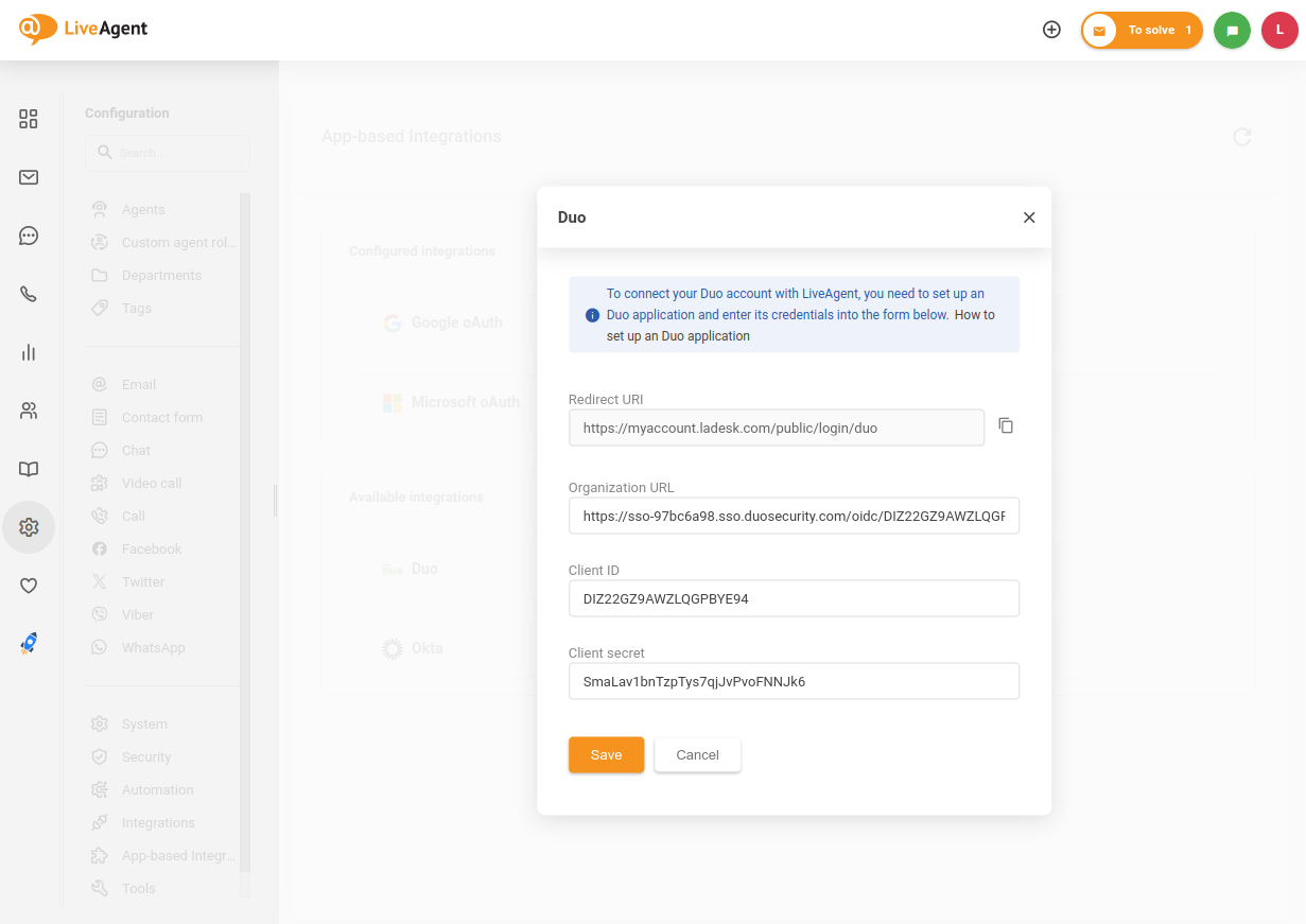Duo管理パネルで新しいアプリの設定を進める前に、LiveAgentアカウントにログインし、「Configuration」(設定)>「App-based integrations」(アプリベース連携)に移動して、Duo連携をクリックしてセットアップを開始します。セットアップ画面に表示されているリダイレクトURIをコピーしてください。このURIは、Duoアプリの設定で使用します。
