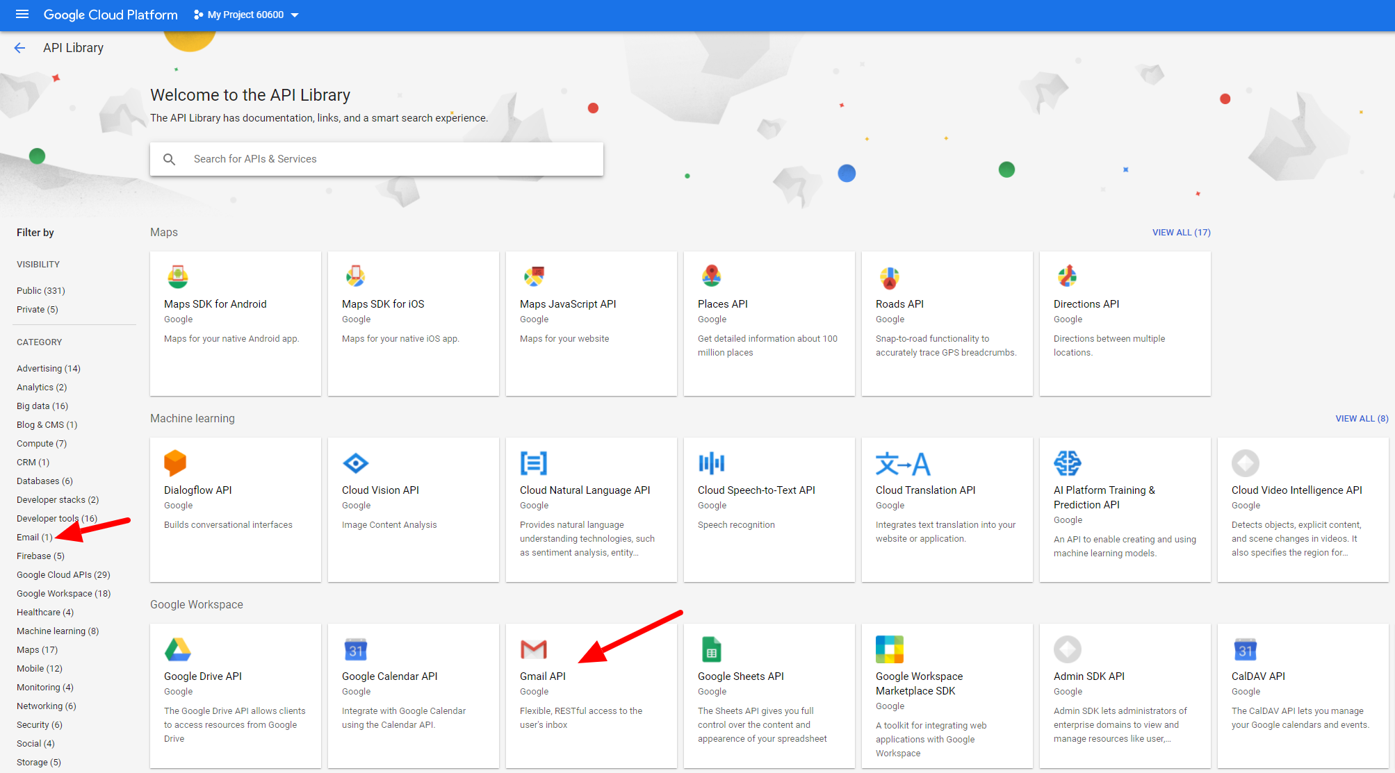 - Gmail APIセクションを見つけてクリックします。画面右端のフィルターやページ上部の検索フィールドを使うと、Gmail APIセクションを見つけやすくなります。