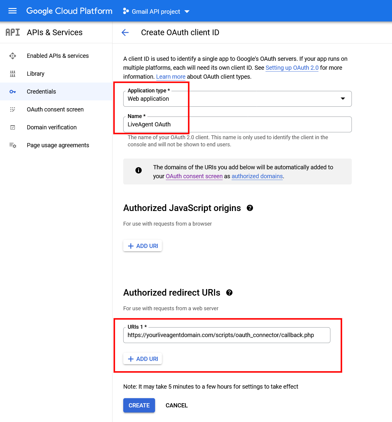 - アプリケーションタイプとして「Website application」を選択し、用途がわかるような名前を付けます。また、https://your.domain/scripts/oauth_connector/callback.php を指すAuthorized redirect URIを必ず追加してください。URLの「your.domain」の部分は、実際のLiveAgentインストール環境のURLに置き換えてください。