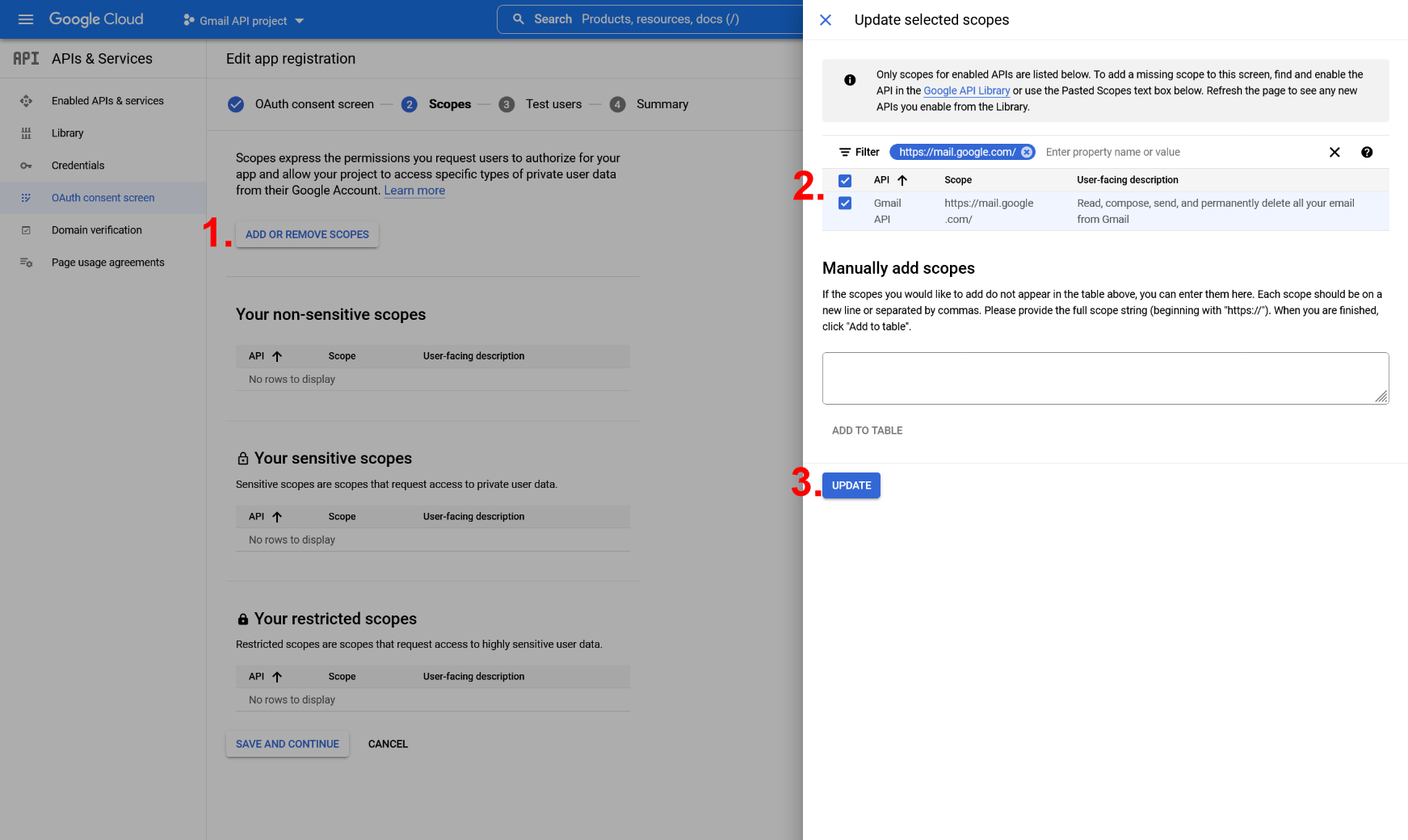 - Add or remove scopesボタンをクリックしてアプリで使用するスコープを追加し、https://mail.google.com/ スコープを見つけます。その横のチェックボックスをオンにして、Updateボタンをクリックします。